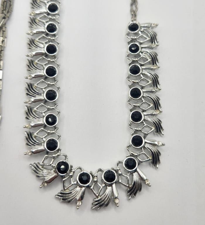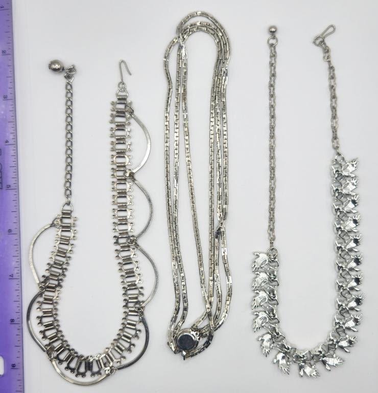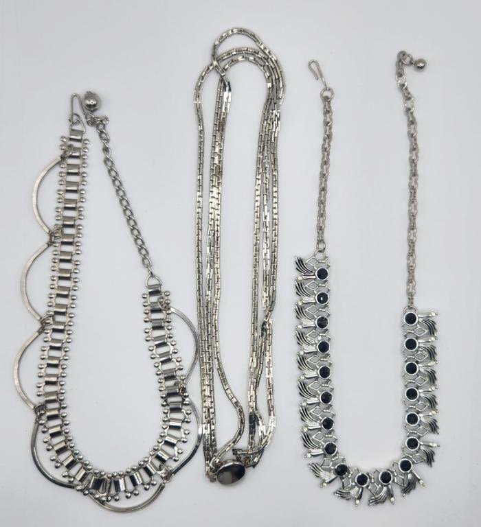 WITH BLACK RHINESTONES (1)MULTI LAYERED WITH SILVER BUTTON CLOSURE (1)LINKED STYLE WITH SCALLOP ACCENTS-DIFF LENGTHS (SEE PICTURES)