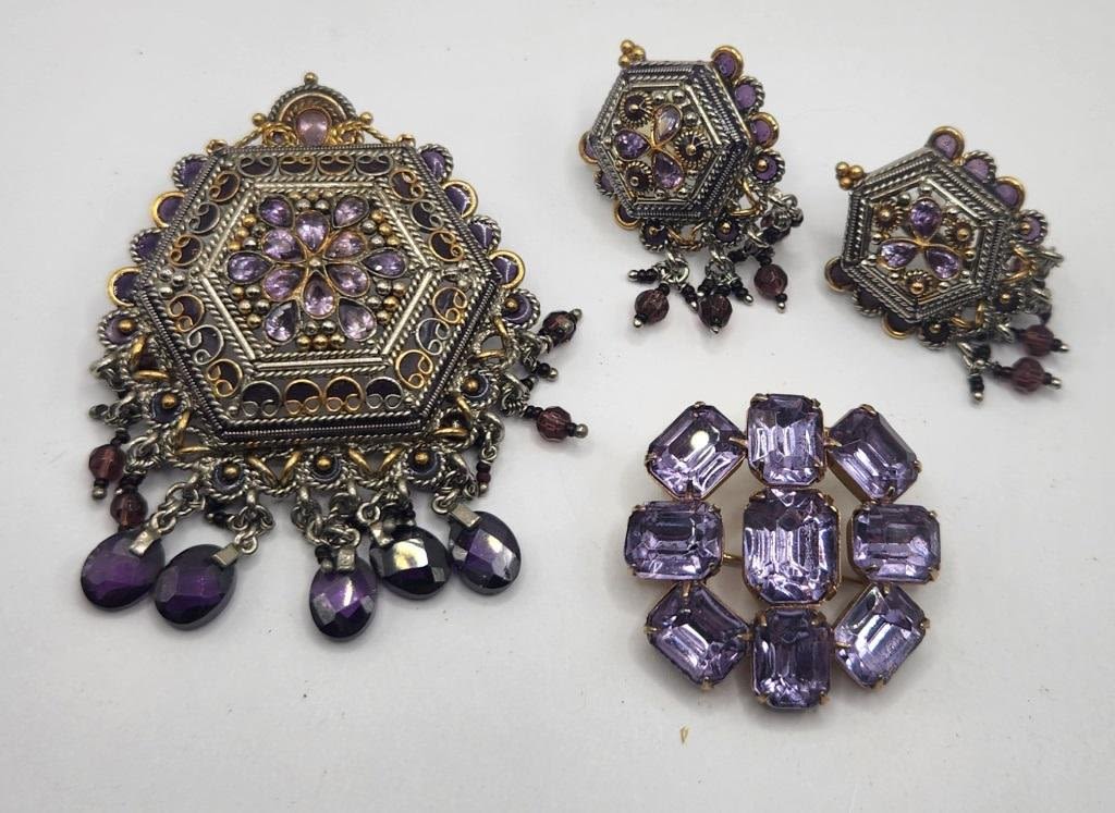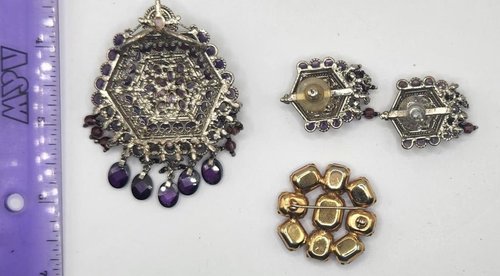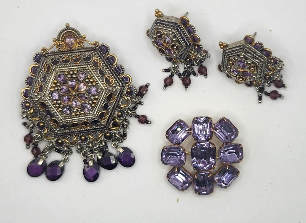 RHINESTONES & DANGLY TASSLES WITH MATCHING PAIR OF PIERCED EARRINGS WITH BONUS LAVENDAR RHINESTONE BROOCH