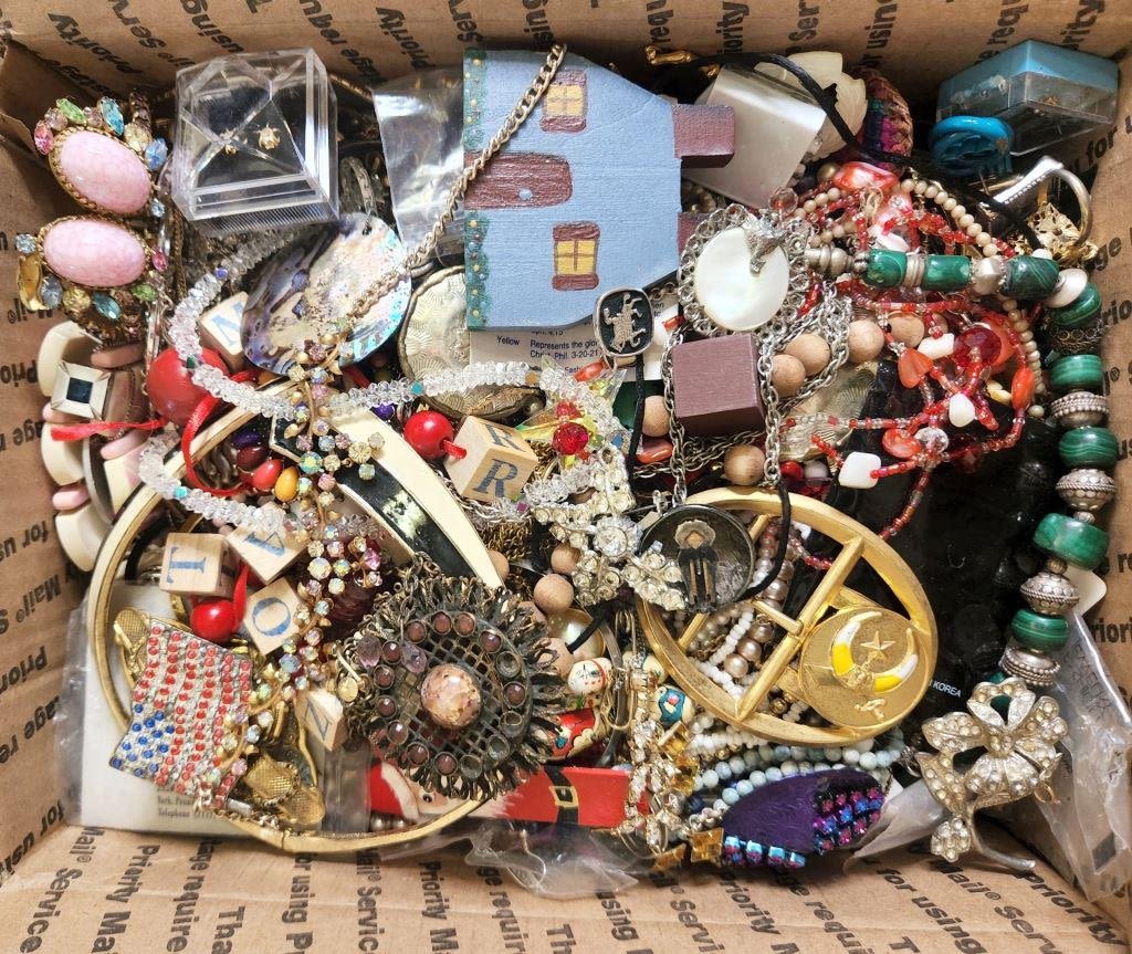 EACH LOT is UNIQUE! ABSOLUTELY A TREASURE HUNT – SOME PIECES MISSING STONES or NEEDING REPAIRED – GREAT FOR THE PINTEREST / CRAFT PERSON. MANY ITEMS NAMED – MEDIUM FLAT RATE BOX FULL (Shipping is MED. FLAT RATE COST)