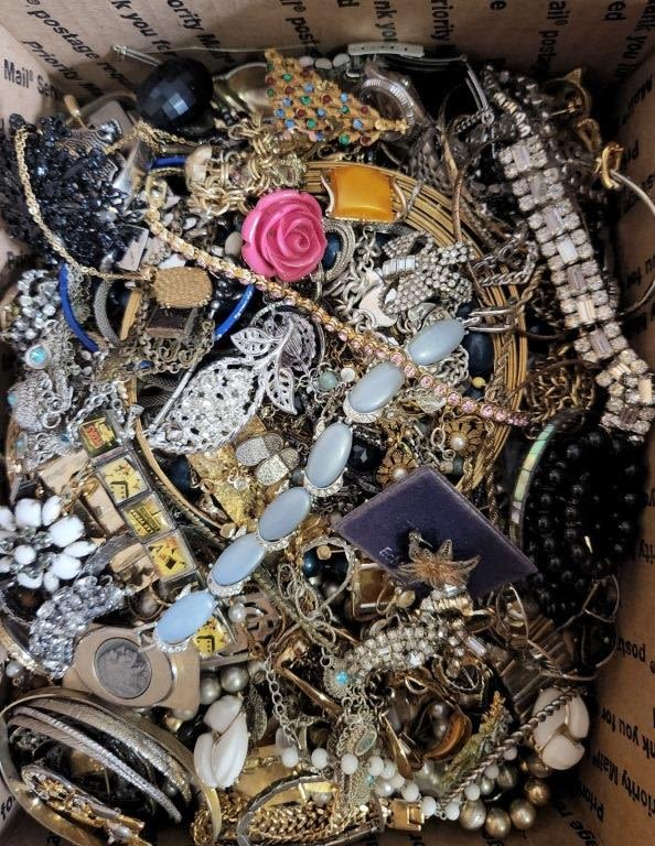 EACH LOT is UNIQUE! ABSOLUTELY A TREASURE HUNT – SOME PIECES MISSING STONES or NEEDING REPAIRED – GREAT FOR THE PINTEREST / CRAFT PERSON. MANY ITEMS NAMED – MEDIUM FLAT RATE BOX FULL (Shipping is MED. FLAT RATE COST)