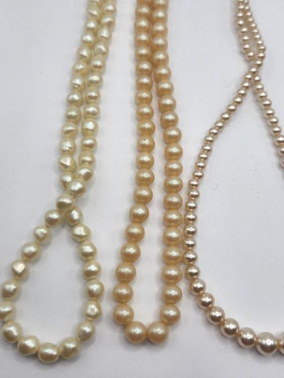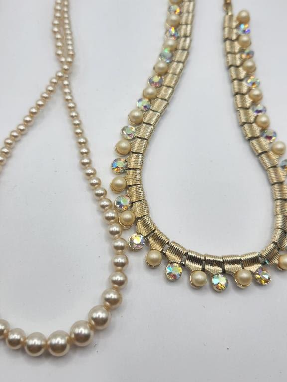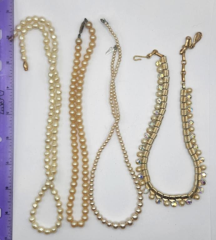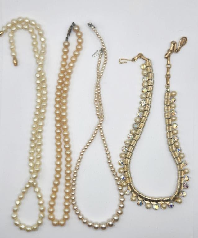 AND FAUX PEARLS (1 RHINESTONE MISSIN) & (3)FAUX PEARL NECKLACES-ALL DIFF LENGTHS (SEE PICTURES)