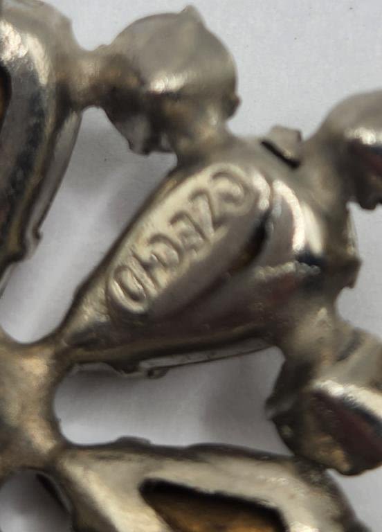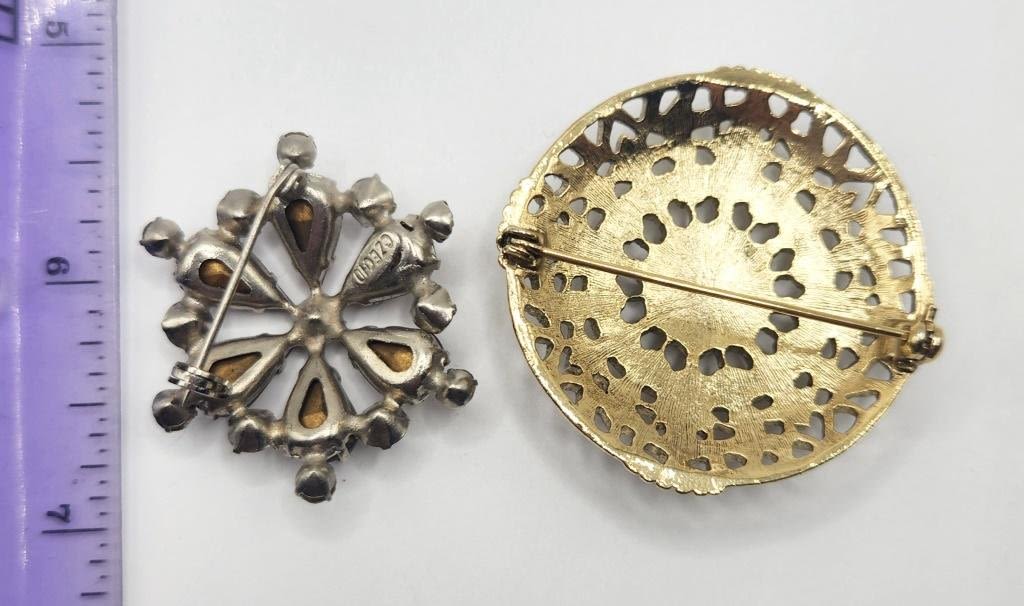 CLEAR AND RUBY RED RHINGSTONES (1)GOLD TONED CIRCULAR WITH EMRALD COLORED AND PURPLE RHINESTONE ACCENTS & PURPLE ENAMEL