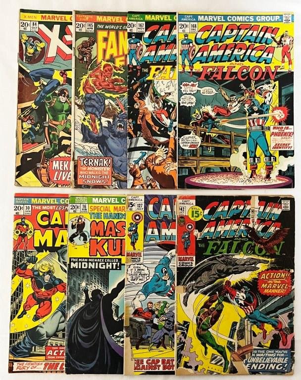 1974 #16 MASTER of KUNG FU 1st MIDNIGHT, 1974 #30 CAPTAIN MARVEL – BOTH INTACT NICE AVG CONDITION, 1973 #167 & #168 CAPTAIN AMERICA, 1974 #145 FANTASTIC FOUR, 1973 #84 X-MEN, plus (2) CAPT AMERICA – BOTH WITH ISSUES
