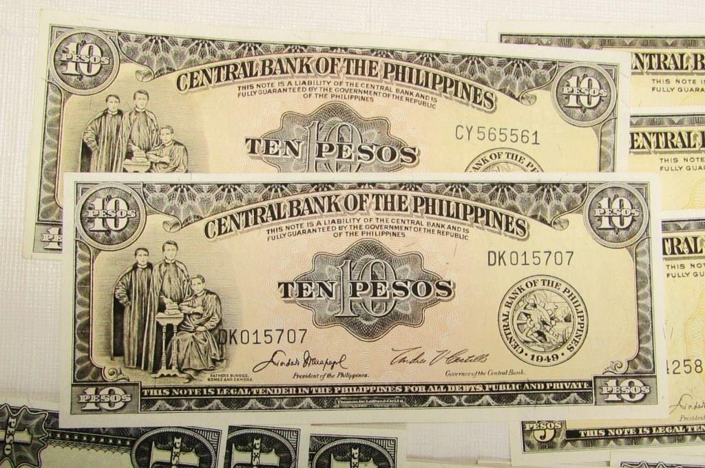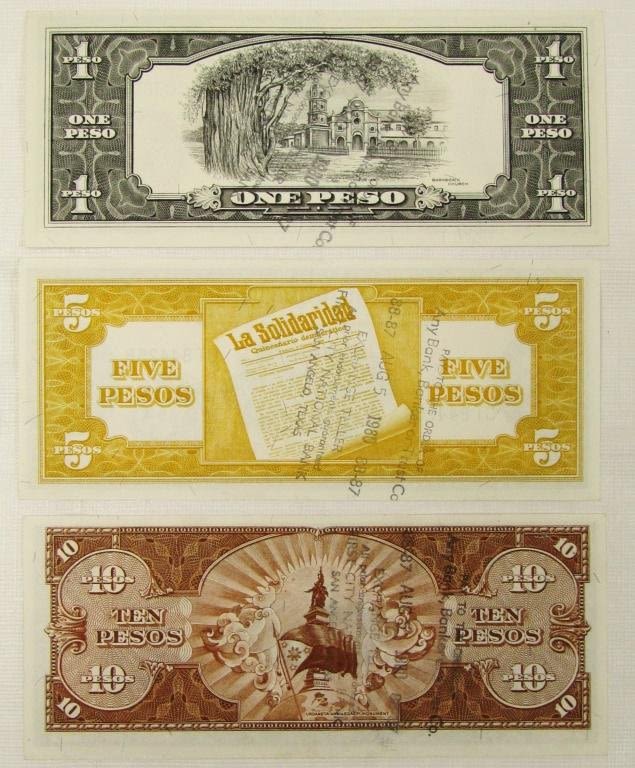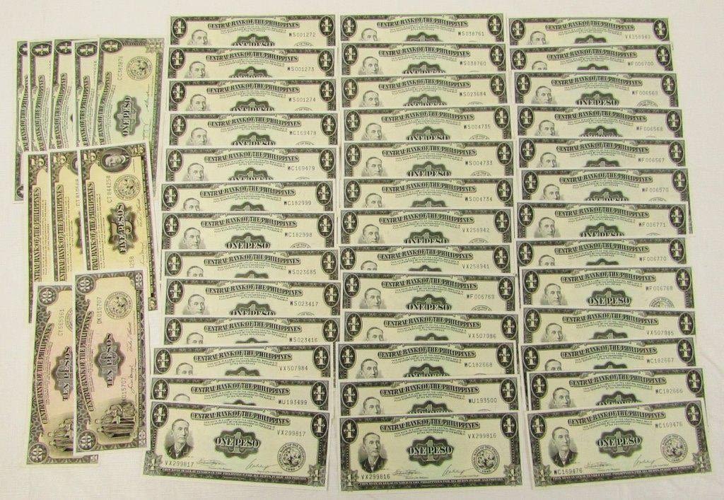 CRISP UNC LOT – SOME SERIAL # SEQUINCE NOTES – (3) 5 PESOS, (2) 10 PESOS, (41) $1 PESOS
