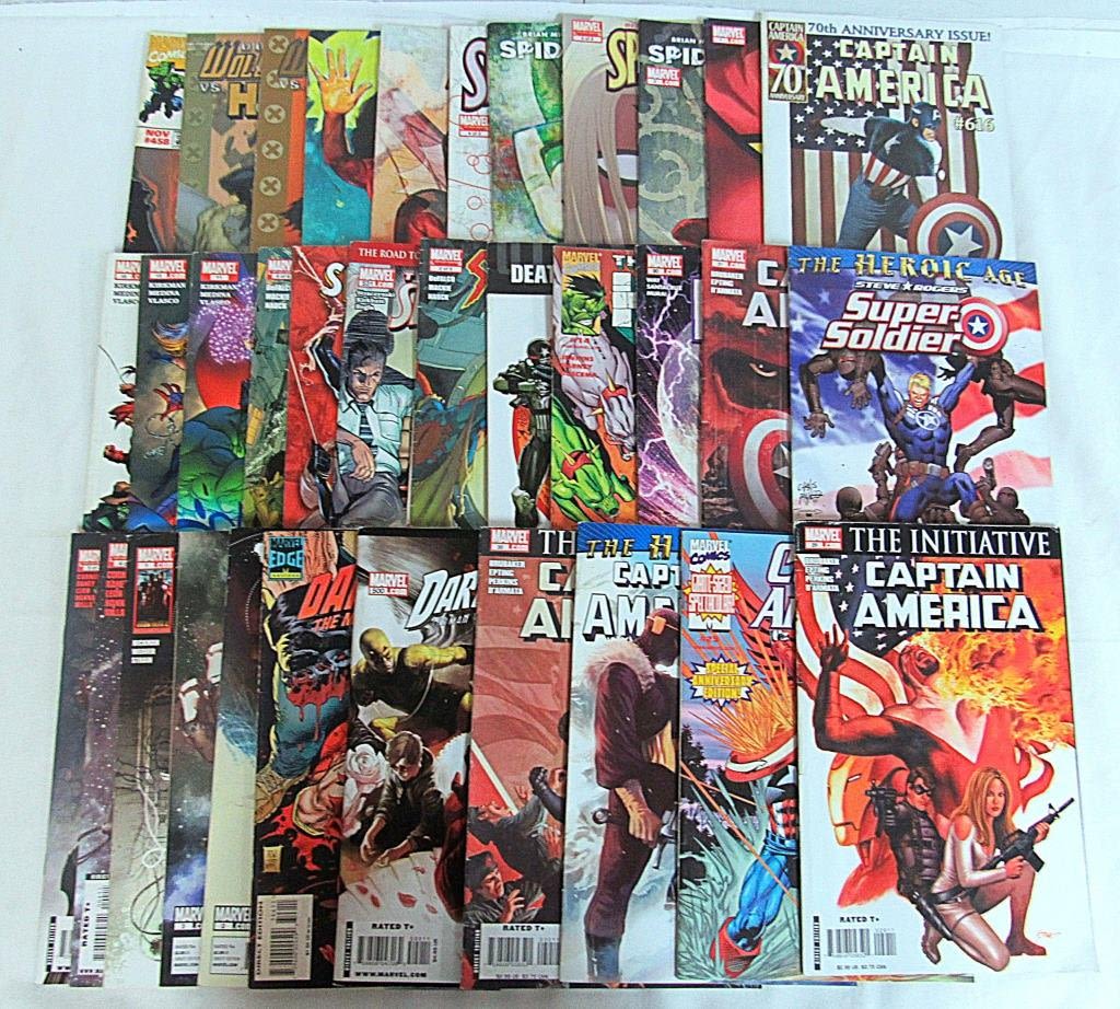 Mixed lot including assorted Captain America, Spiderman, Spiderwoman, Hulk, and many more Marvel comics. All in nice condition. Includes 70th Anniversary Issue of Captain America issue #616, and 2009 #1 issue of