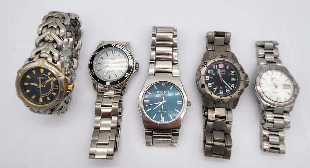 DECADE DIAMOND-SEIKO KINETIC 100M CALENDAR-SILICON SOLAR-WENGER SWISS MILITARY CALENDAR-BULOVA 50M DAY DATE-ALL WATCHES UNTESTED