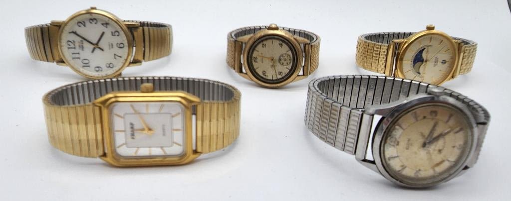 QUARTZ MOON PHASE-ELGIN MISSING CRYSTAL-SHARP QUARTZ-ELGIN 17 JEWELS SELF WINDING-TIMEX INDIGLO QUARTZ-ALL WATCHES UNTESTED