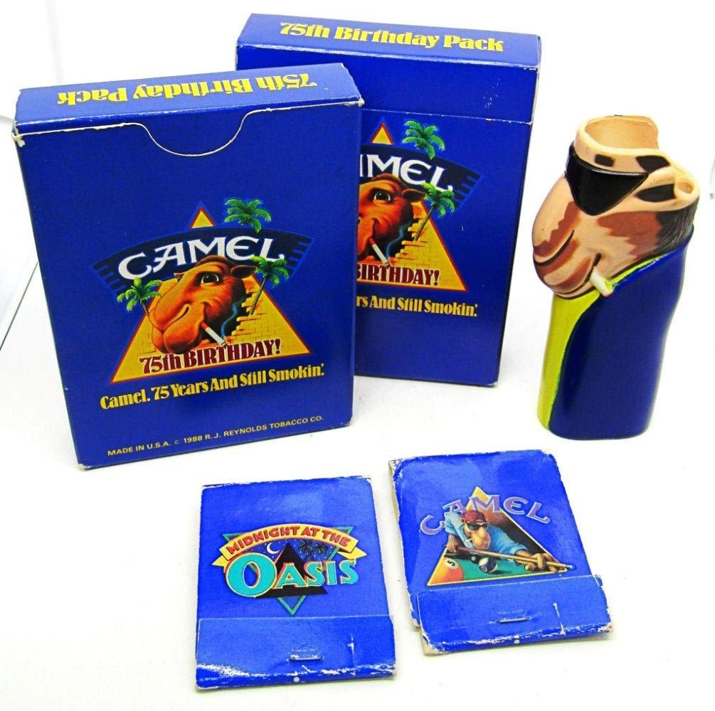 (2) 75TH BIRTHDAY PLAYING CARDS , (2) MATCH PACKS , CAMEL LIGHTER COVER!