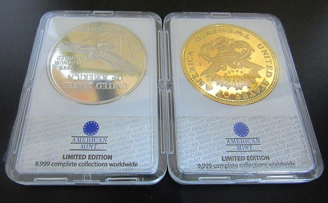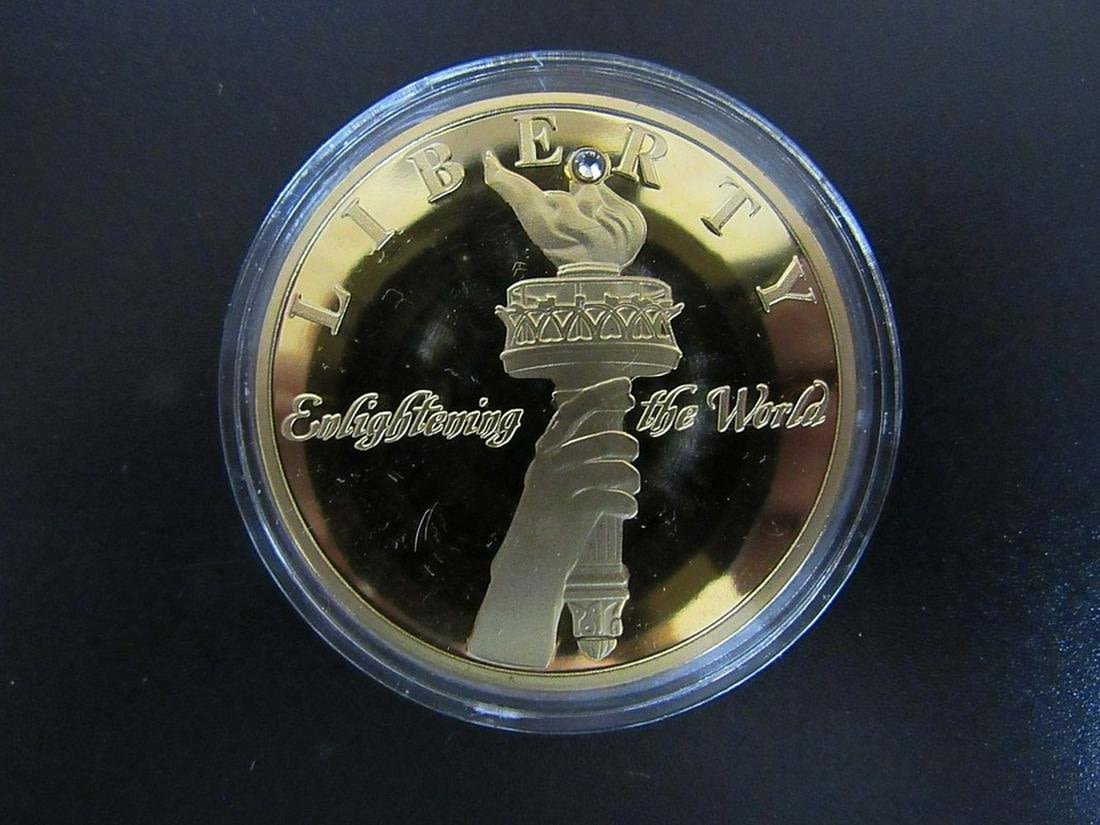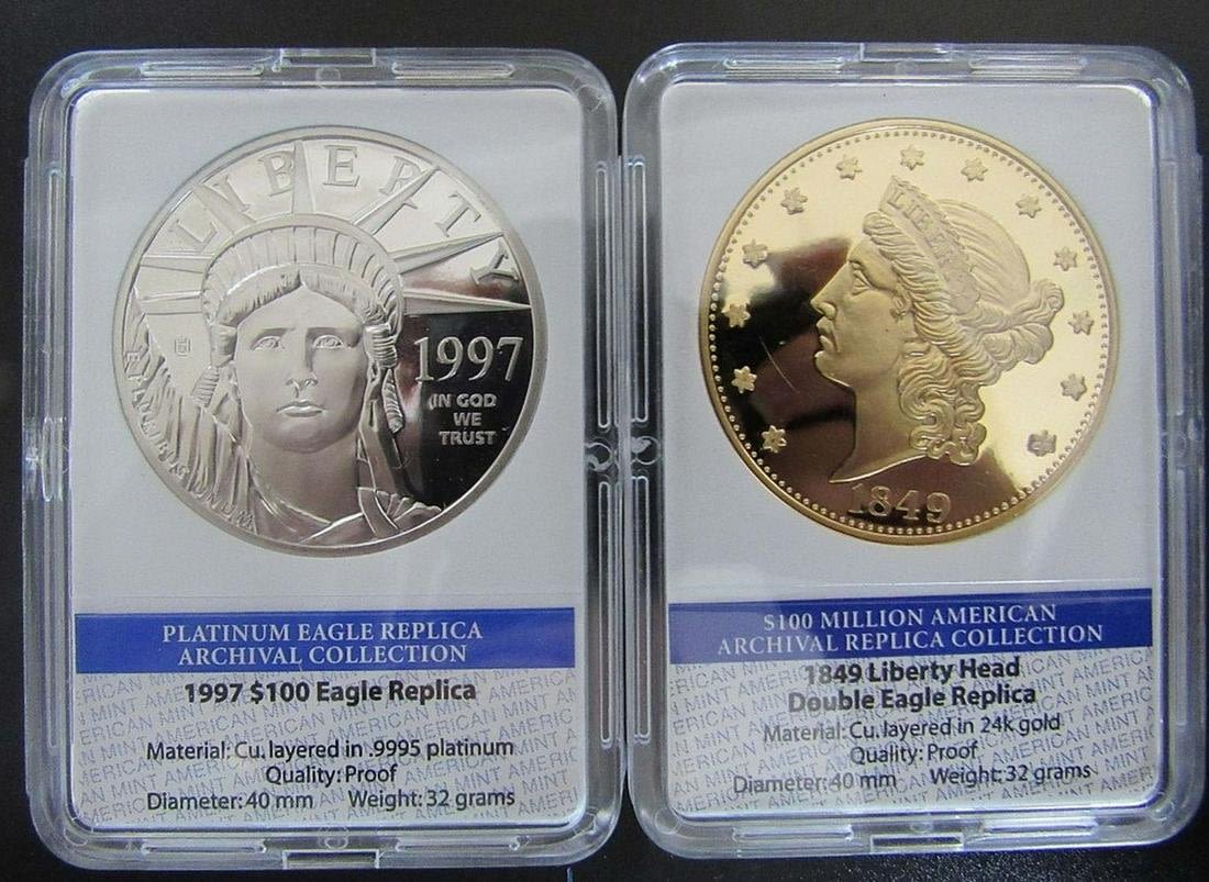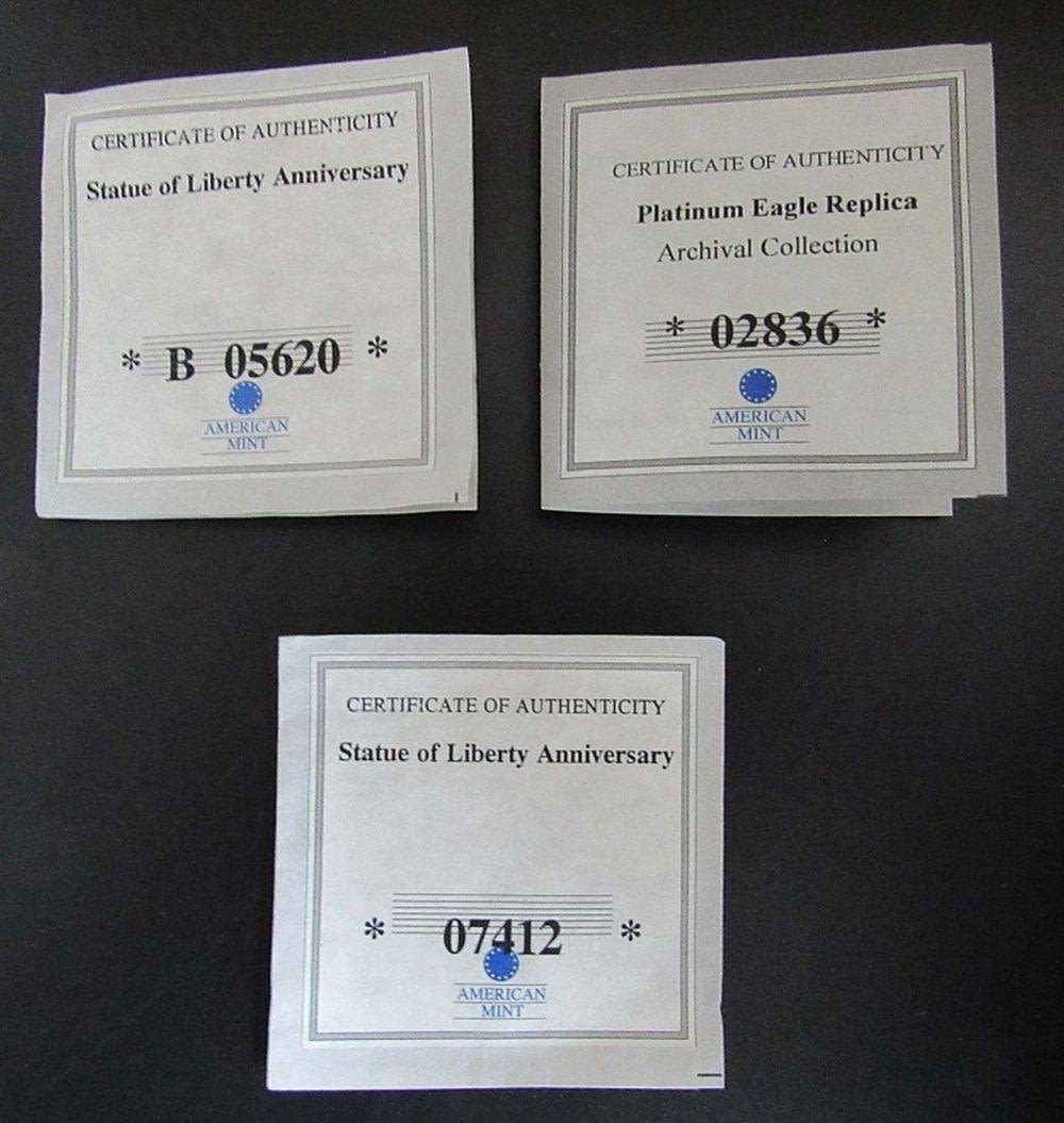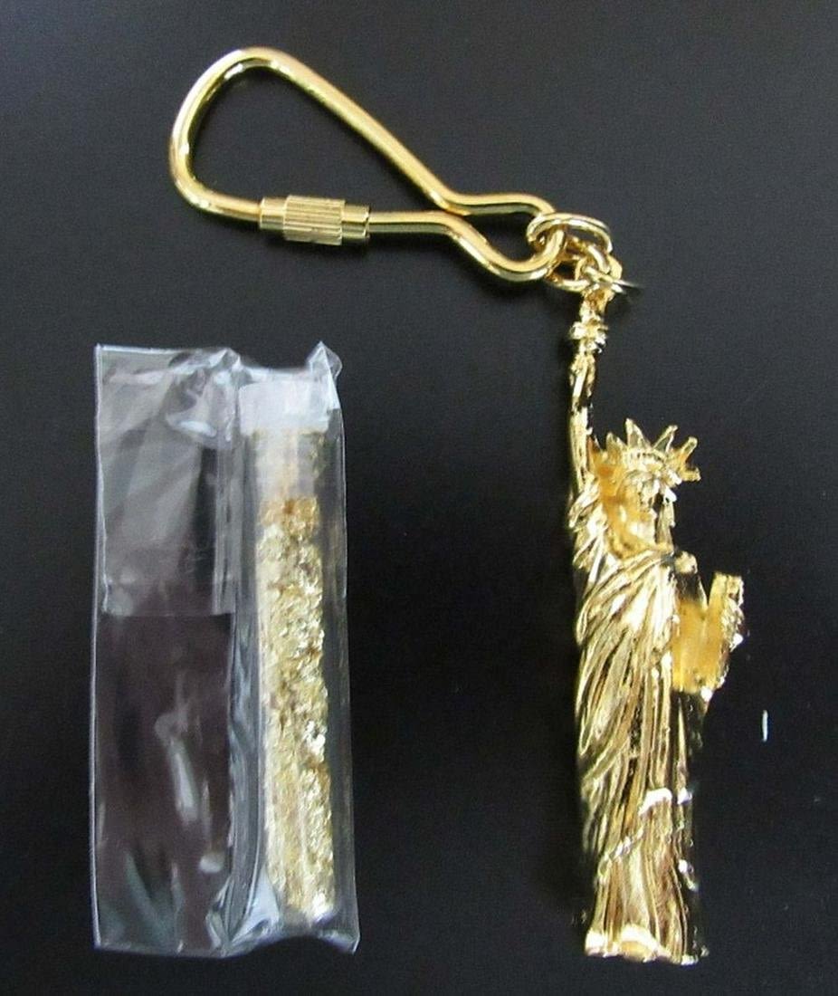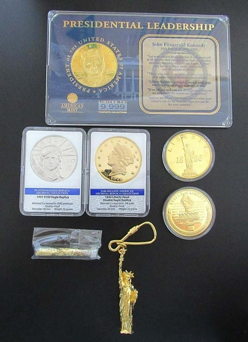 REPLICA PLATINUM EAGLE, REPLICA DOUBLE EAGLE, (2) STATUE of LIBERTY COMMEMS, KEY CHAIN & GOLD FLAKE TUBE