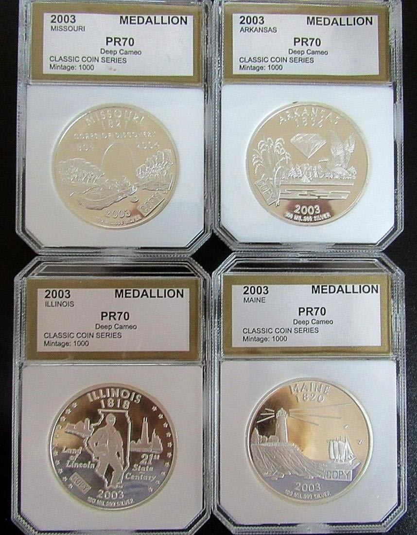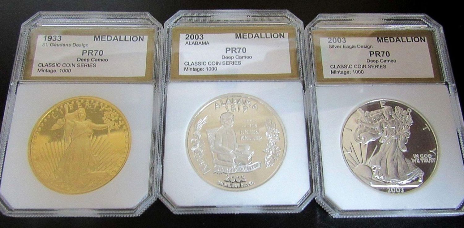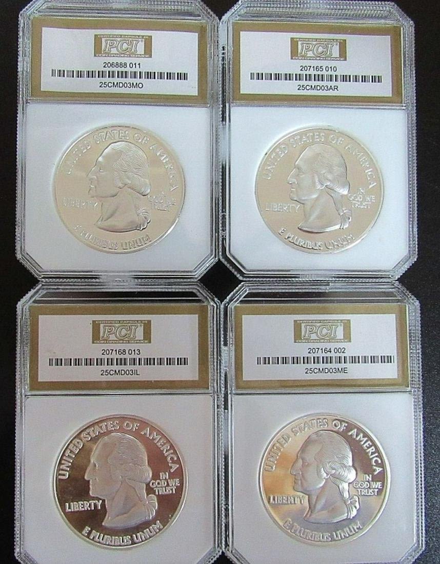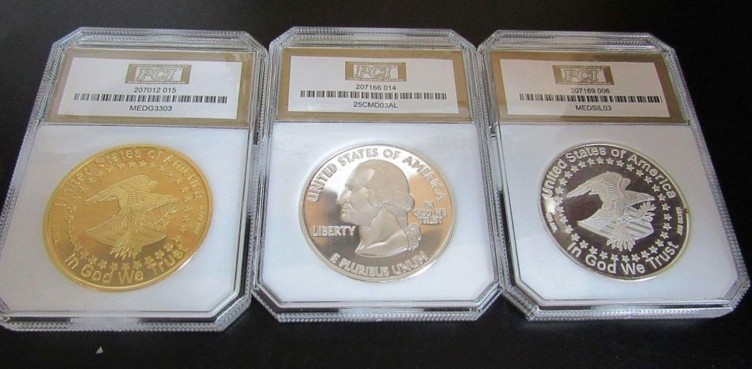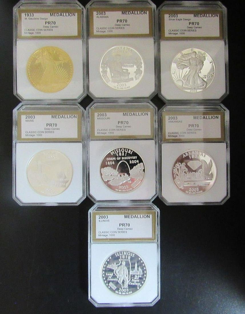 (6) "COPY COINS" CLAD PROOF LAYERED in 100 ml .999 SILVER plus (1) "COPY COIN" ST GAIDENS DESIGN PROOF CLAD COIN LAYERED in 100 ml .999 GOLD – ALL in PCI PR70 HOLDERS