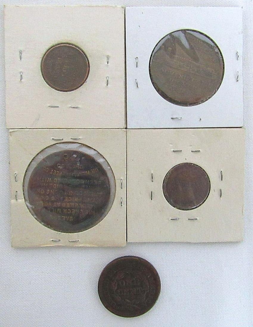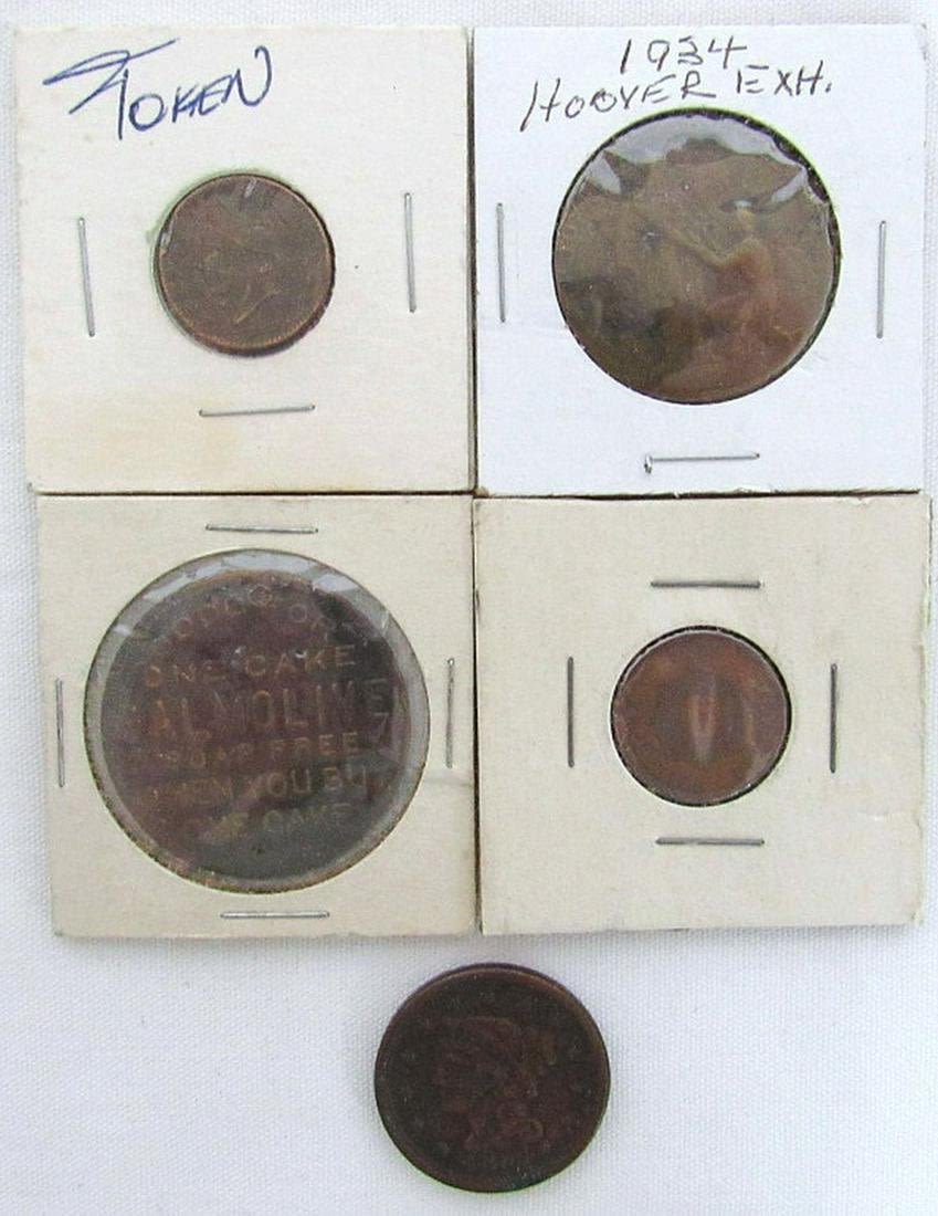 1854 LARGE CENT, 1934 HOOVER EXHIBIT, PALMOLIVE SOAP FREE ONE CAKE, 1919 UN CENTAVO, 1863 STORE TOKEN
