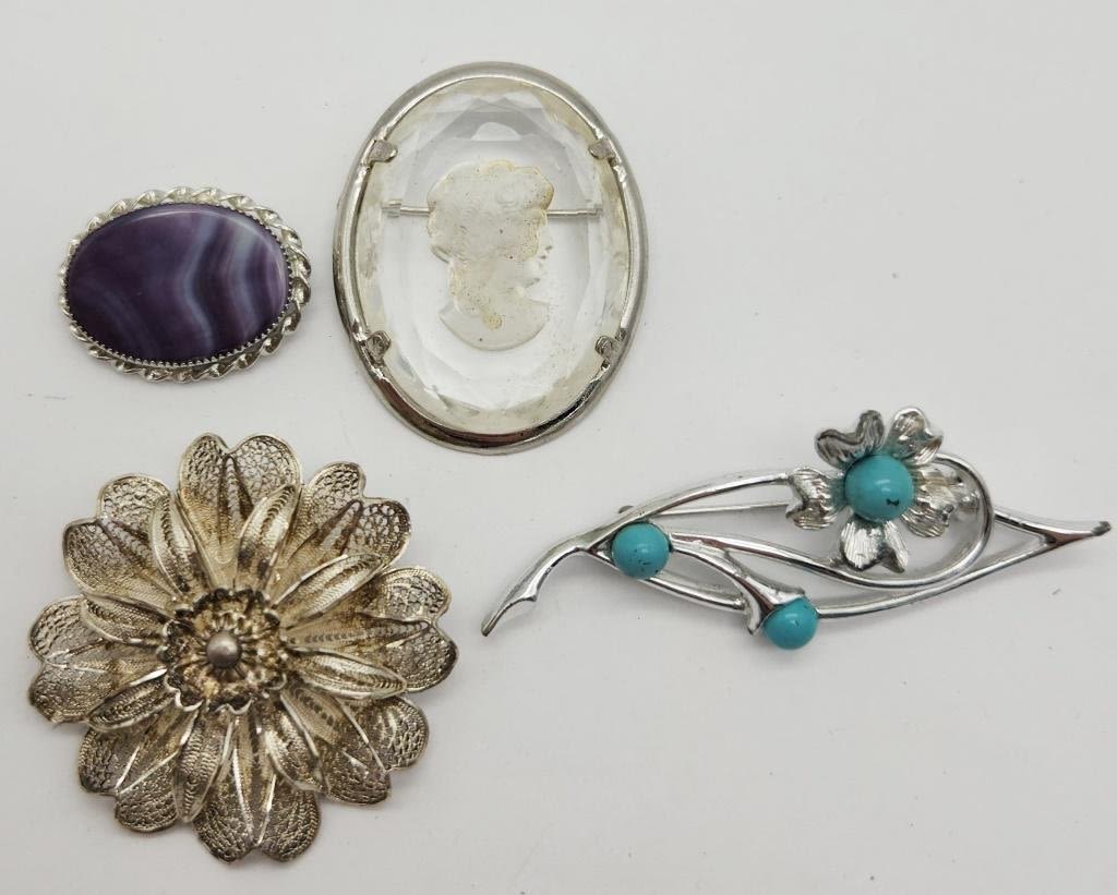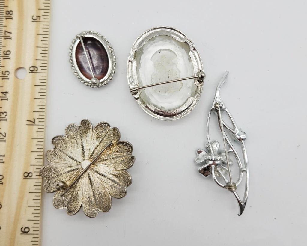 4-VINTAGE SILVER TONED BROOCHES: CAMEO-