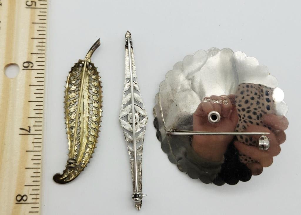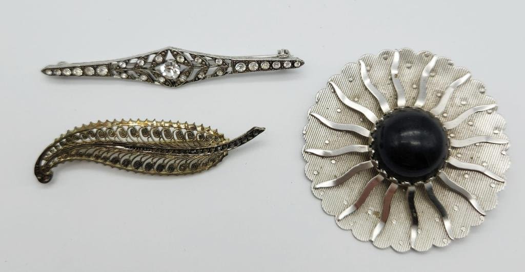 (1)FILIGREE LEAF (1)WITH CLEAR RHINESTONES (1)SARAH COVENTRY CIRCULAR WITH BLACK LUCITE CENTER