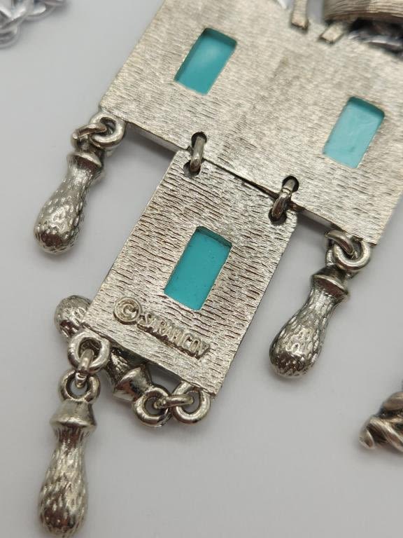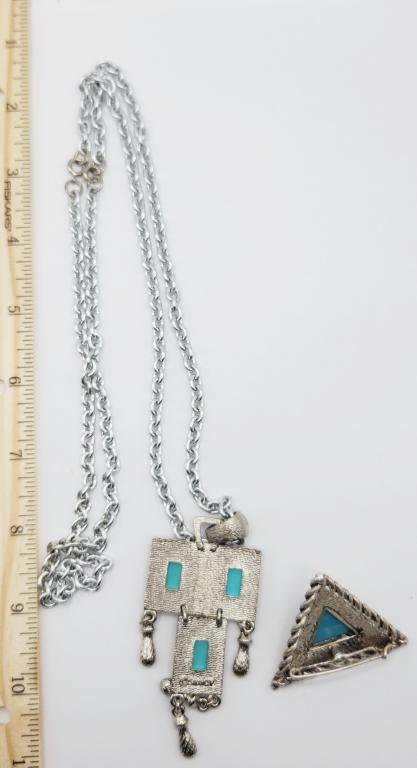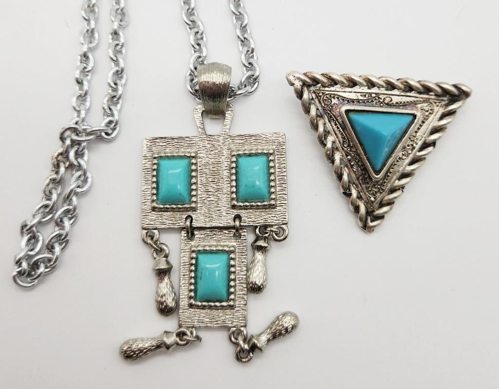 FAUX TURQUOISE PENDANT & DANGLY CHARMS PLUS CORDINATING TRIANGLE BROOCH