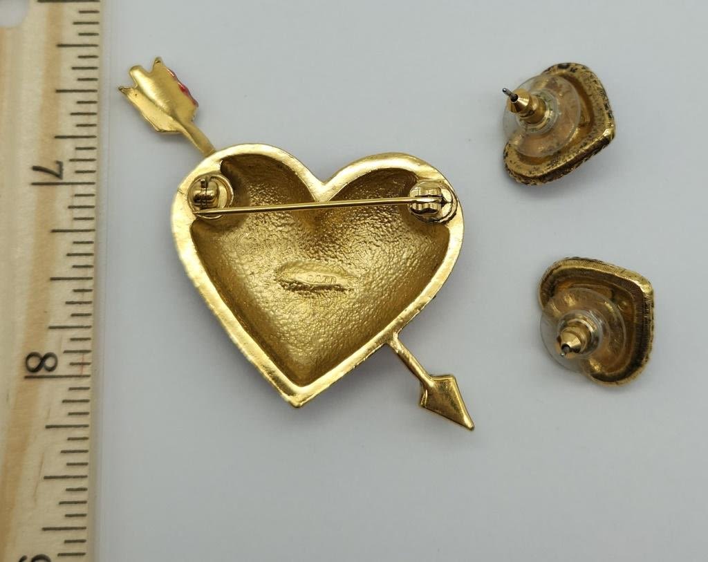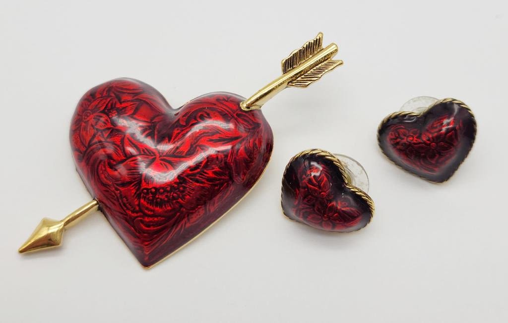 BROOCH WITH RED ENAMEL WITH MATCHING PAIR OF PIERCED EARRINGS