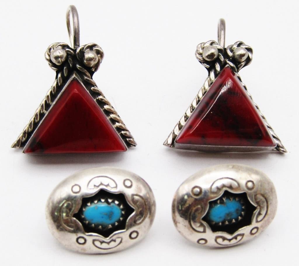 TRIANGLE RED NATURAL STONE & OVAL TURQUOISE PIERCED EARRINGS (12 DWT)