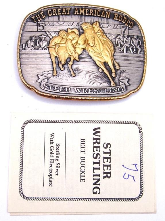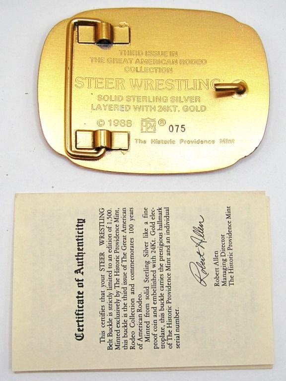 125th ANNIVERSARY THE GREAT AMERICAN RODEO STEER WRESTLING SOLID STERLING SILVER LAYERED WITH 24KT GOLD – 1988 THE HISTORIC PROVIDENSE MINT in ORIGINAL BOX / COA (101 DWT)
