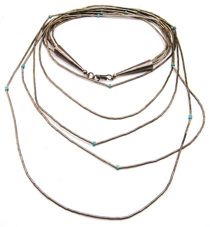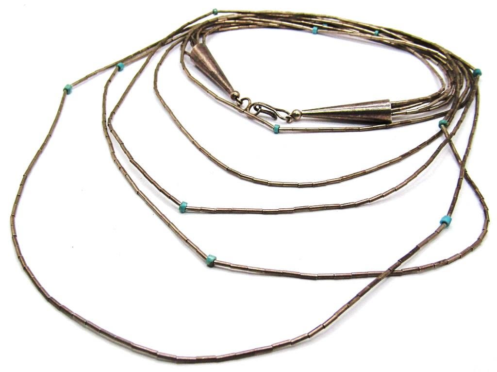 Delicate vintage liquid silver beaded piece with small turquoise stones and a working clasp. 19 inches long, and 12 dwt