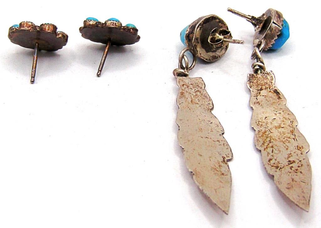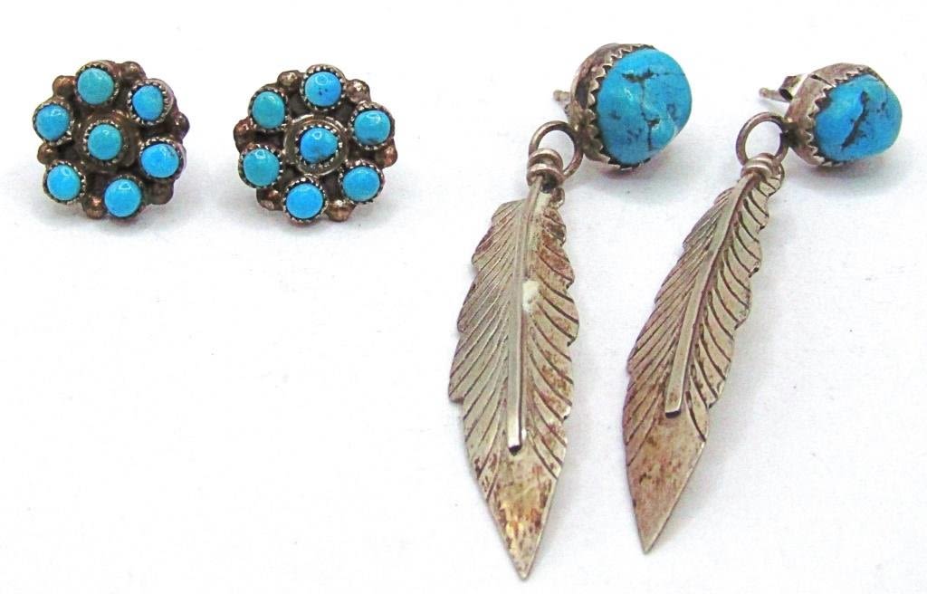 2 pairs of earrings with turquoise set in both pairs. One small pair and one with dangling silver feathers. Both for pierced ears. (5dwt)