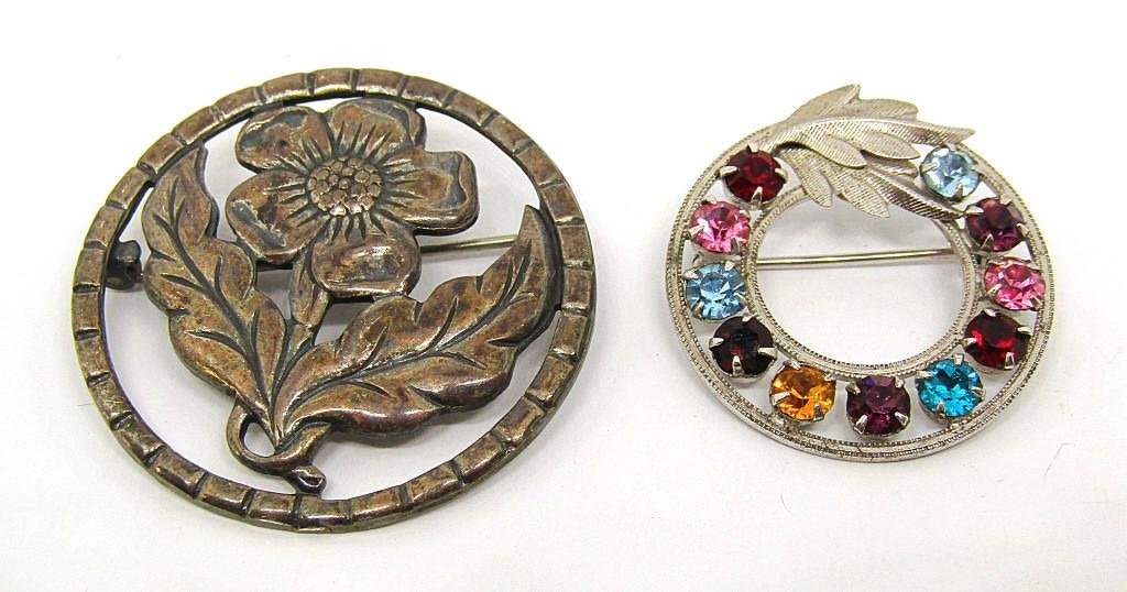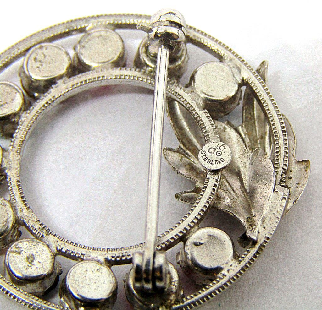 Two detailed floral design pins. One solid sterling, and the other has multicolored gemstones. Both clasps in good shape. (10 dwt)