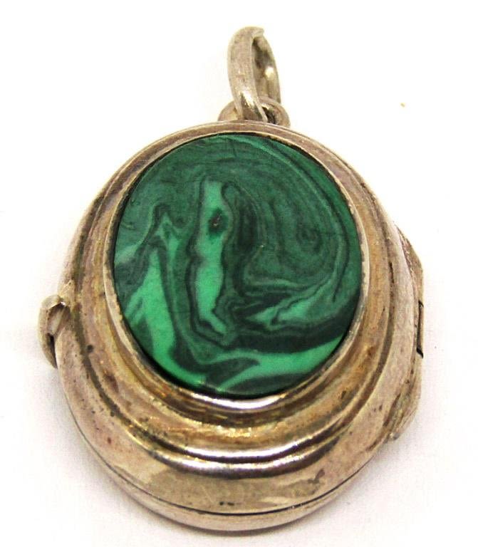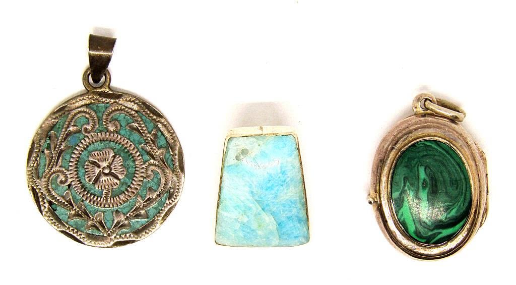Three charms with green natural stone in varying colors set in each. One charm opens like a locket. (9 dwt)