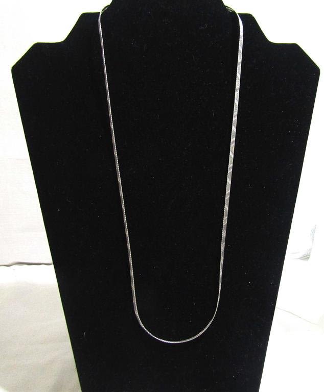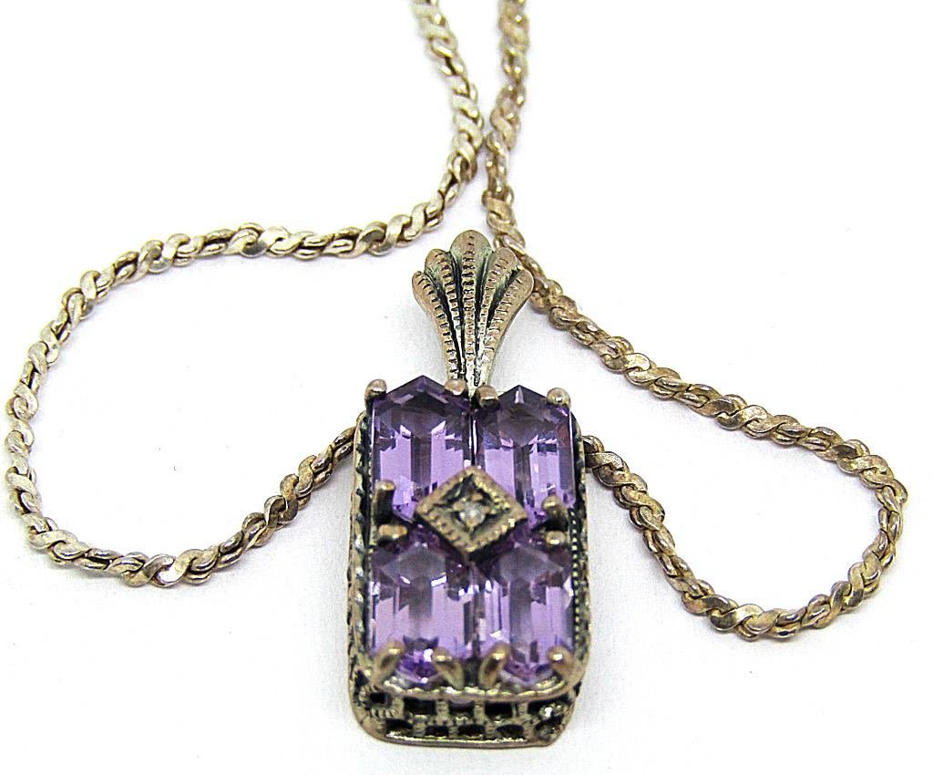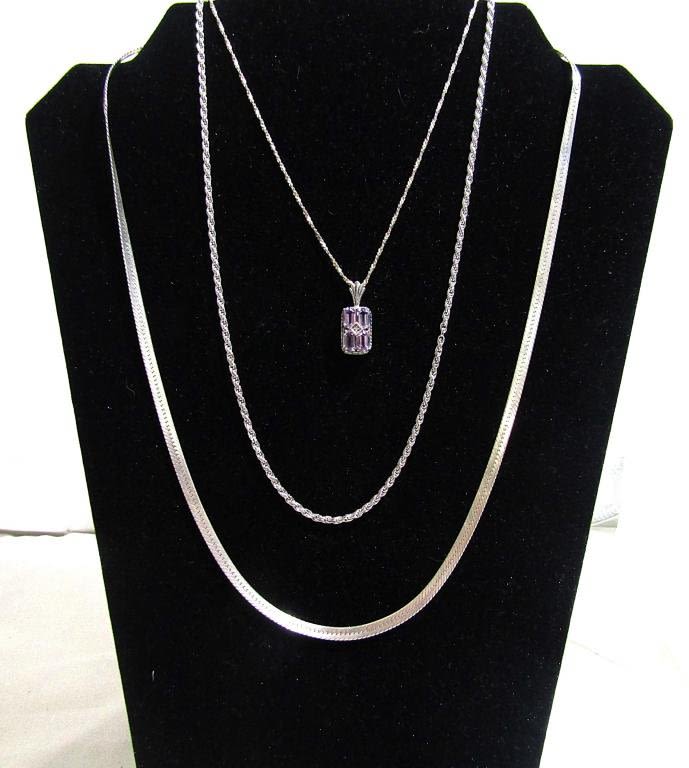 Three sterling necklaces, one in a snake chain style (24 in), one is a solid sterling rope chain (23.5 in), and the third is a small rope chain with a purple gemstone pendant (24 in). All have working clasps (20