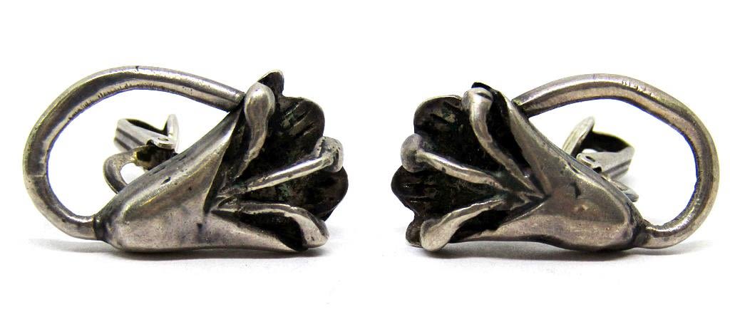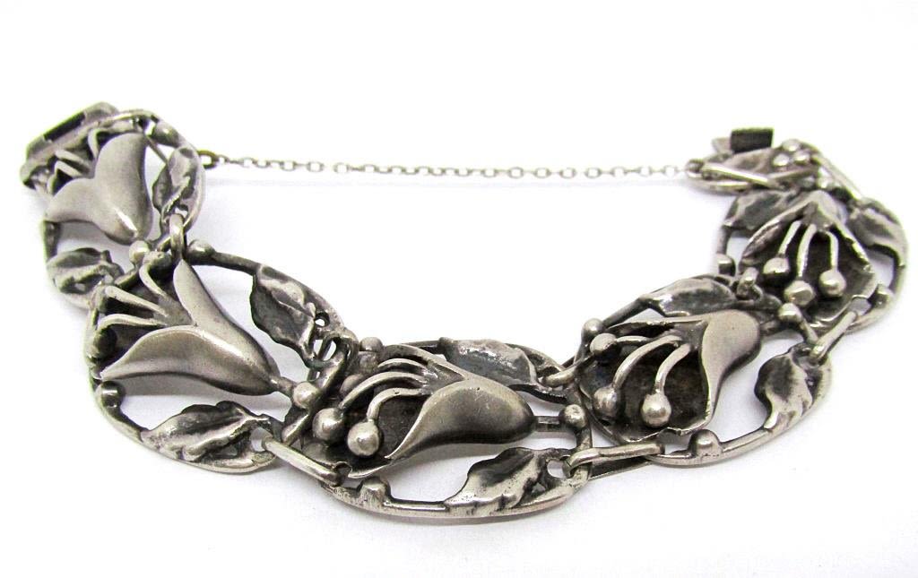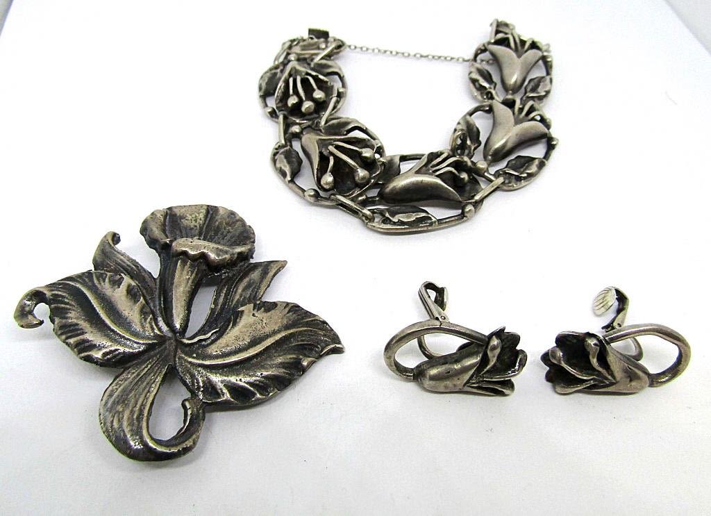 Four good solid sterling pieces all with southwest lily designs. Includes two identical small lily pins, a large lily brooch, and an intricate 9-10 inch long bracelet with multiple sterling lilies with a
