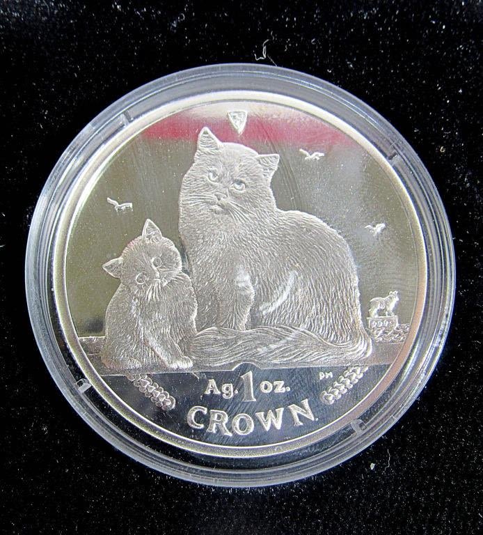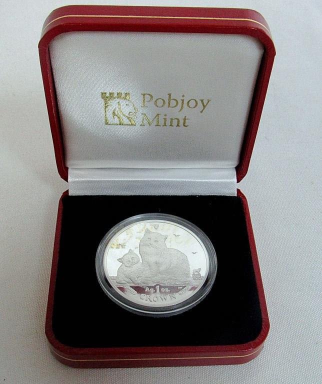 .999 silver coin made at Pobjoy Mint in England featuring cats and Queen Elizabeth II. In original box