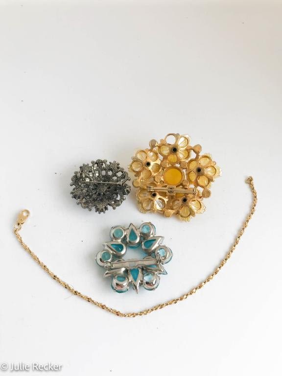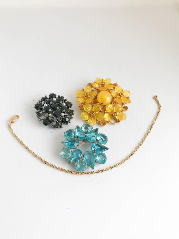 3 BEAUTIFUL BROOCH + CHAIN , ONE YELLOW STONE MISSING