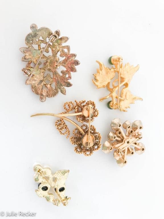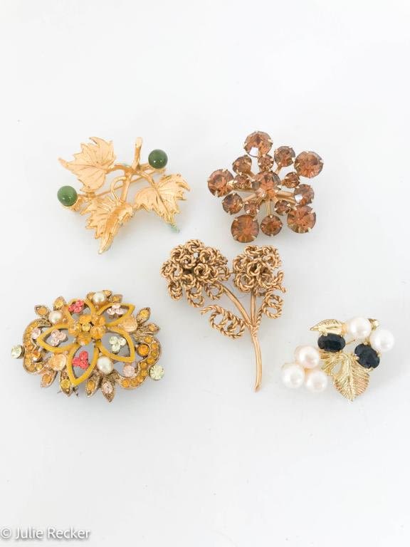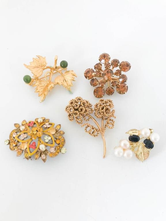 VINTAGE HOBE LEAF BROOCH & 4 OTHER BROOCH W STONES