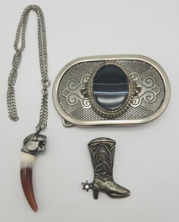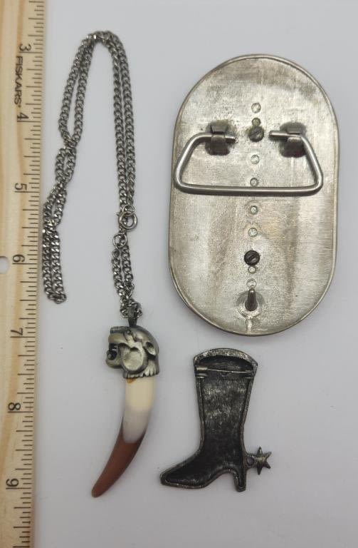 BELT BUCKLE-TIGER FAUX TOOTH PENDANT NECKLACE & (1)COWBOY BOOT WITH SPUR