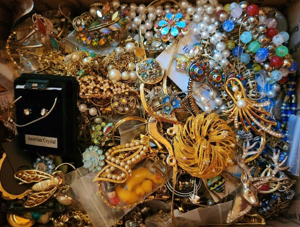 EACH LOT is UNIQUE! ABSOLUTELY A TREASURE HUNT – SOME PIECES MISSING STONES or NEEDING REPAIRED – GREAT FOR THE PINTEREST / CRAFT PERSON. MANY ITEMS NAMED – MEDIUM FLAT RATE BOX FULL (Shipping is MED. FLAT RATE COST)