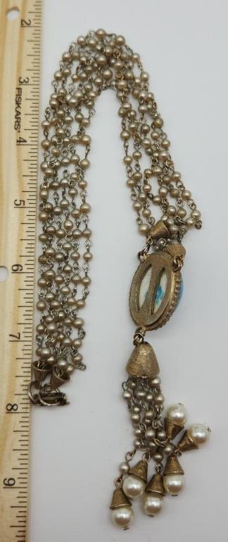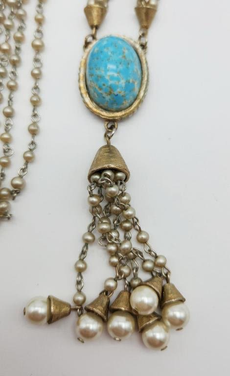 PEARL NECKLACE WITH PENDANT-BLUE LUCITE CENTER-DANGLY TASSLES