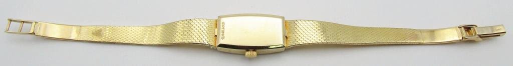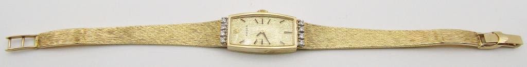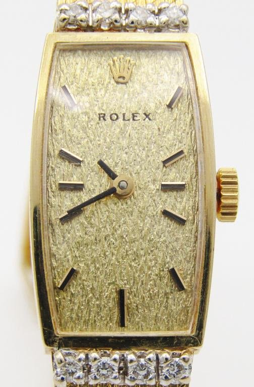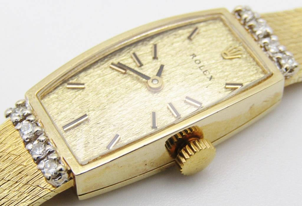 Case is set with 8 diamonds. Clasp with Rolex logo. Bracelet is in good condition with no tears or rips. 17 jewel signed movement. Bracelet measuring approx. 6 3/4 in.