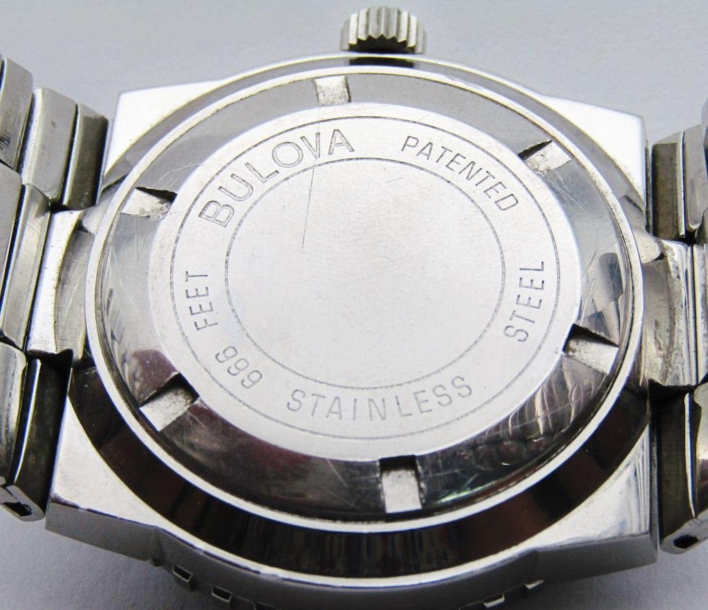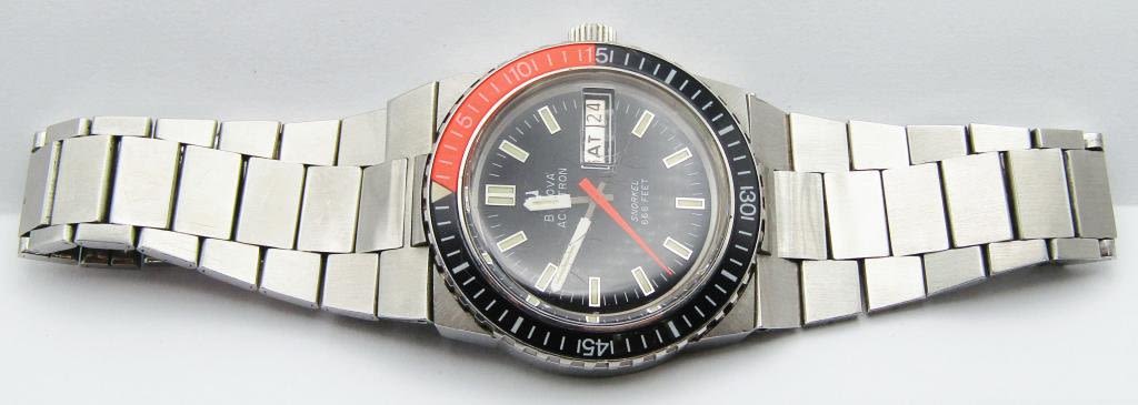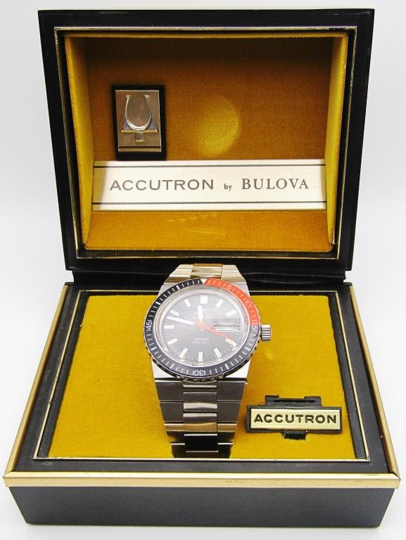 EXCELLENT ORIGINAL DIAL & HANDS, BEZEL with SEVERAL SLIGHT SCRATCHES, BULOVA STEEL BRACELET (AMPLE LENGTH) with 2 BENT CENTER LINKS, CRYSTAL with SOME STRESS CRACKS, 40mm, with ACCUTRON BOX