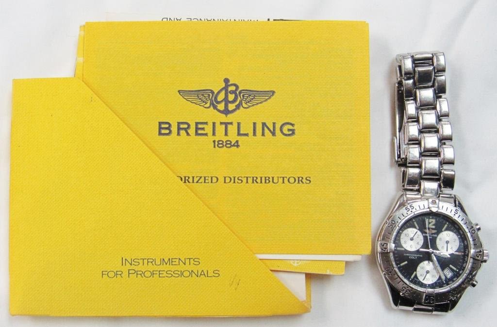 Ref. A53035. Original black dial, stainless case and Breitling bracelet, and rotating bezel. 38mm. Comes with Breitling booklets and warranty