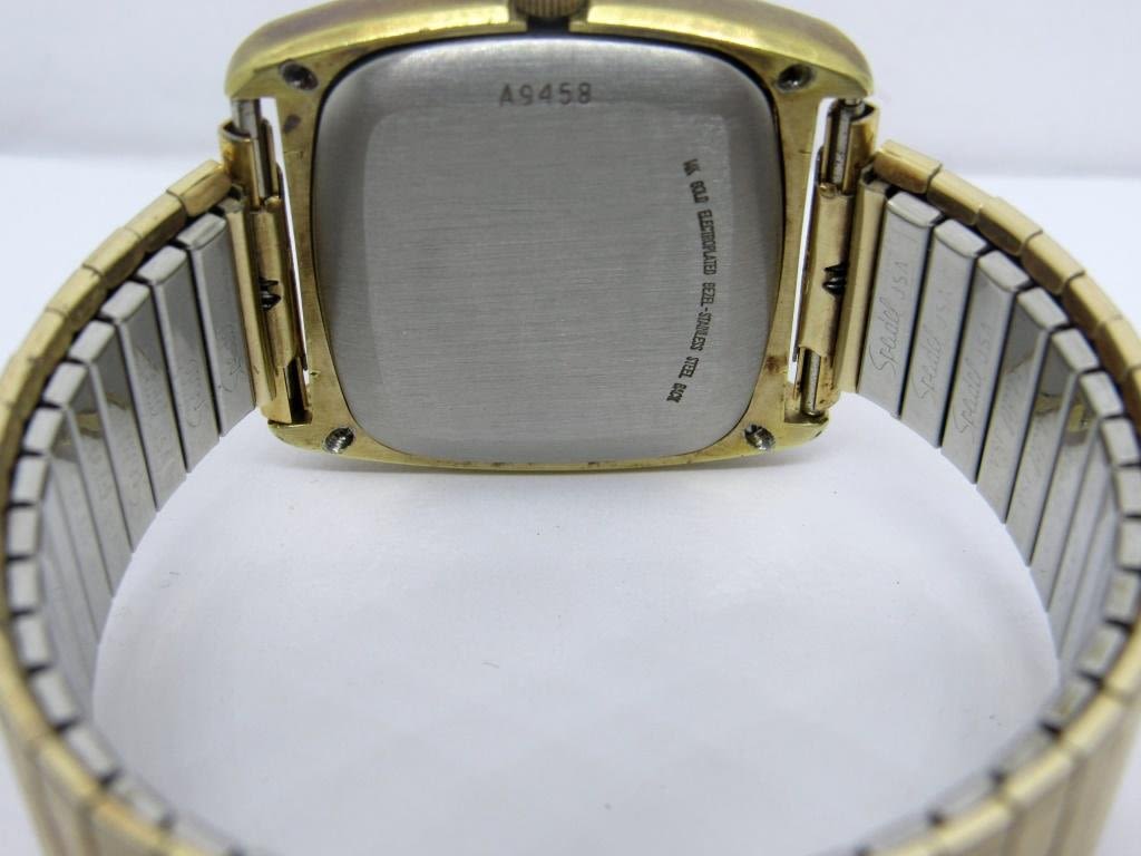 Perfect original TV dial, gold electroplate and stainless case. 17 jewel automatic movement. Case = L 633.2. 36mm x 36mm