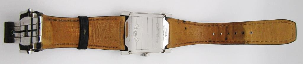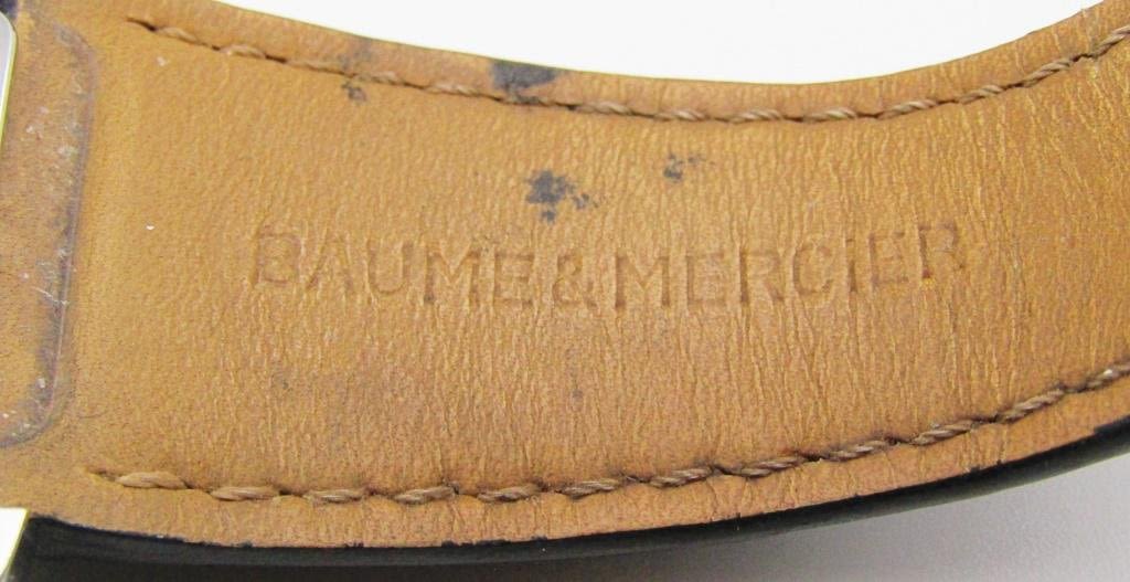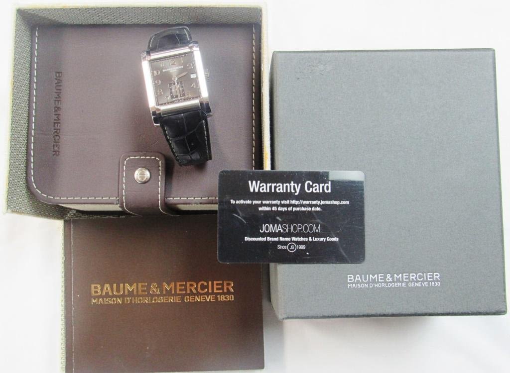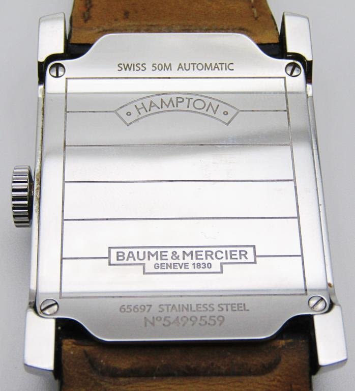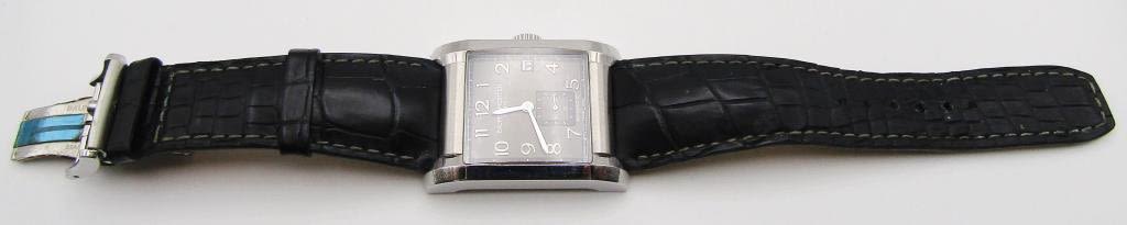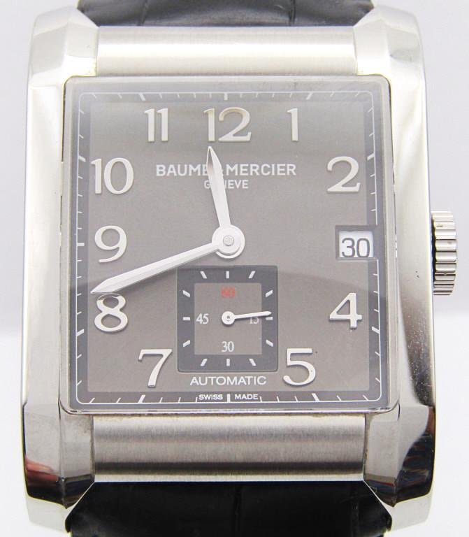 THIS JUMBO STAINLESS STEEL "HAMPDEN" by BAUME MERCIER is in UNWORN CONDITION CASE, DIAL, STRAP and DEPLOYMENT CLASP are ALL PERFECT. 27 jewel AUTOMATIC MOVEMENT (ETA), COMPLETE with ORIGINAL LEATHER BOX, mm=47×34, RETAIL