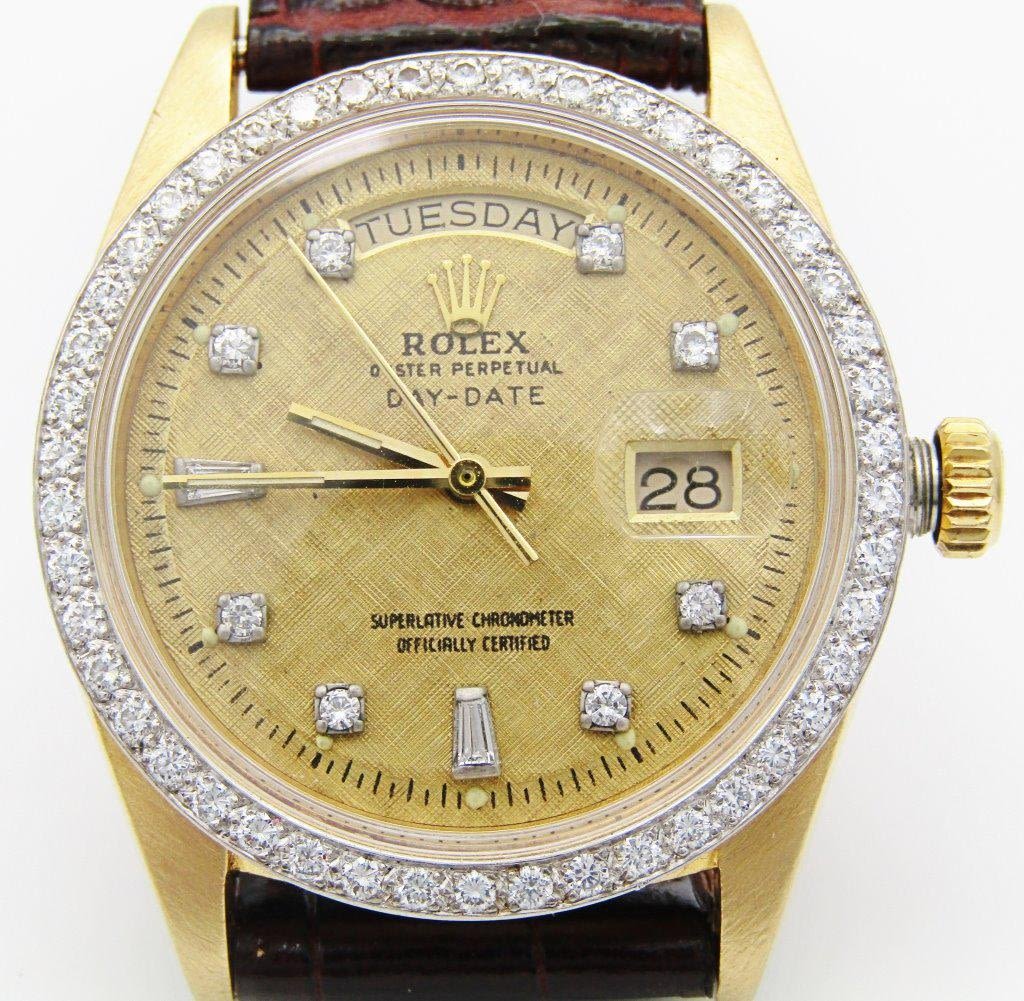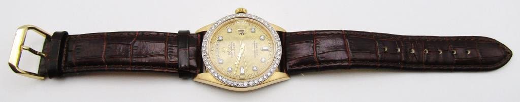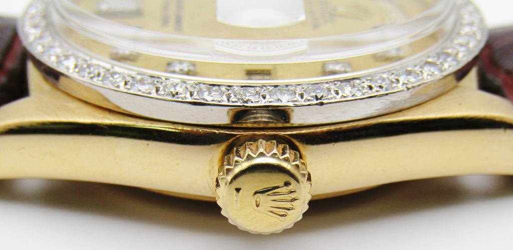 GOLD REFINISHED TESTURED DIAL with AFTERMARKET DIAMOND MARKERS AND DIAMOND BEZEL, 36mm CASE, 26 jewel CAL 1556 MOV’T, CIRC 1977, NEW CRYSTAL AND STRAP
