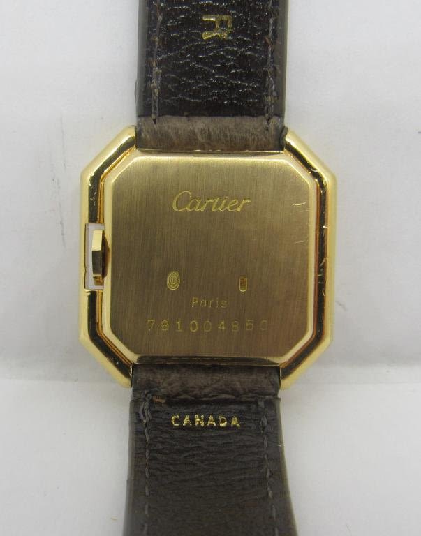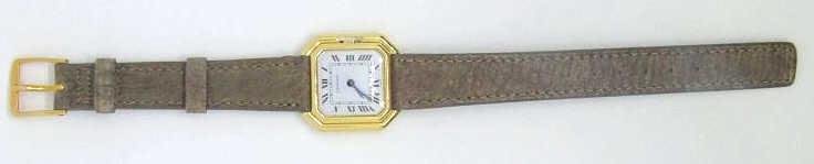 18kt Yellow Gold Octogon Case with Original Trademark White Roman Dial; Fully Signed 17 Jewel Movement; New Strap; 25mm x 25mm.