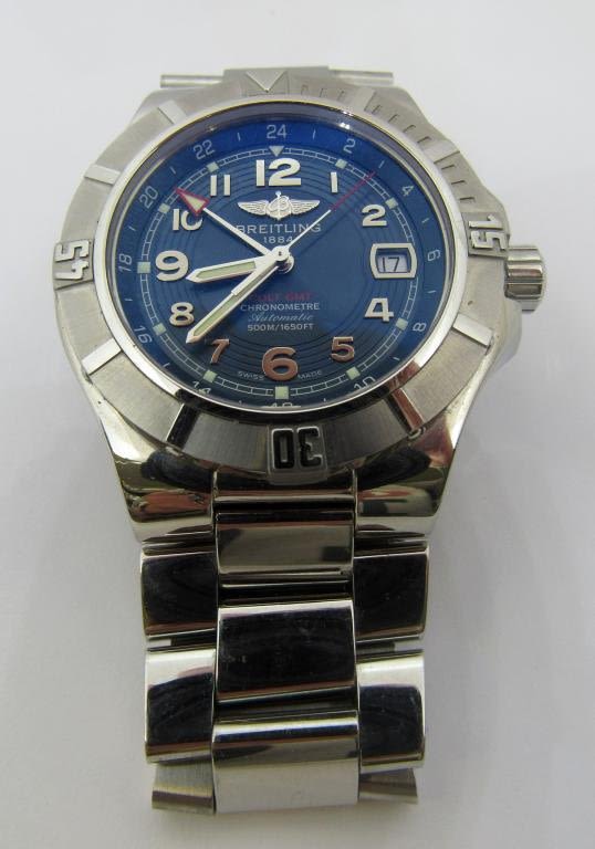 Reference A32370 Mint Orig. Blue Dial, Cal 32 Automatic Movement; Heavy Breitling Bracelet – Short. This watch is in Excellent, Near Mint Condition. 41mm Diameter.