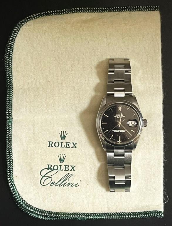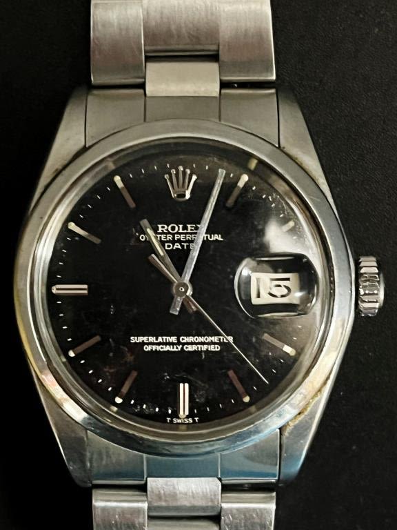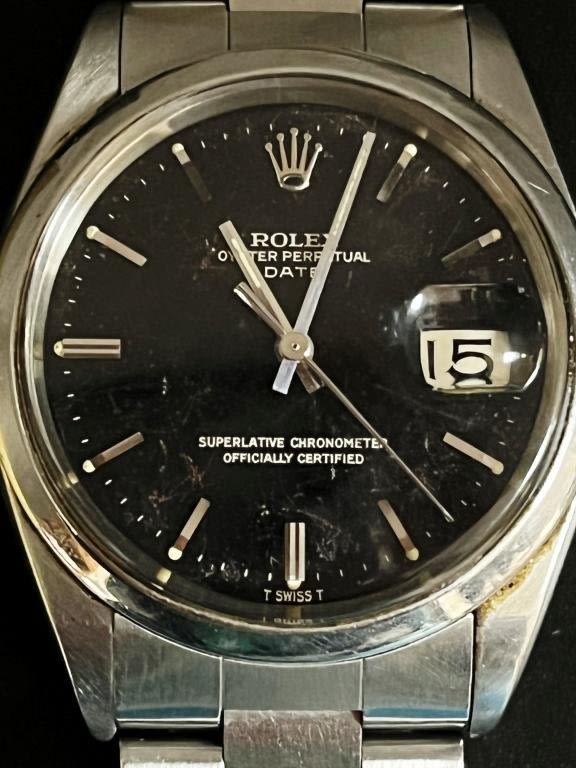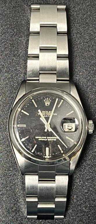 Original Black Dial with Some Spider Cracks And Color Change; REF 1500 Smooth Bezel; 26 Jewel Cal 1570 Mov’t; Newer Heavy Oyster Bracelet; With Service Box and Warranty Dated 2001. All Watches in Running Order when