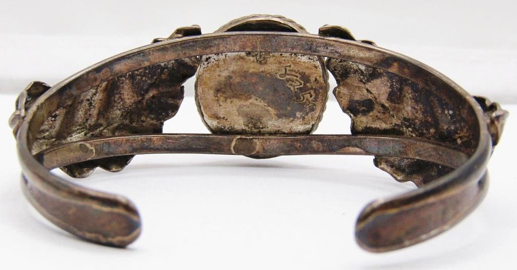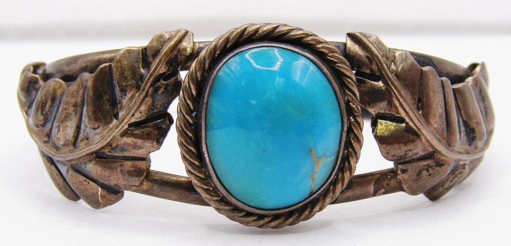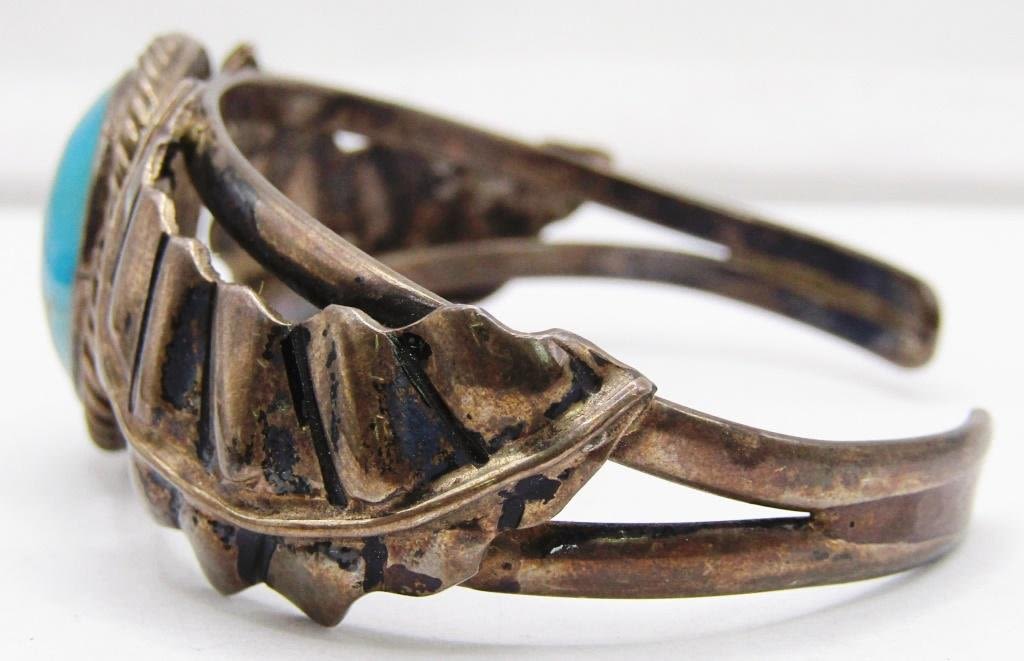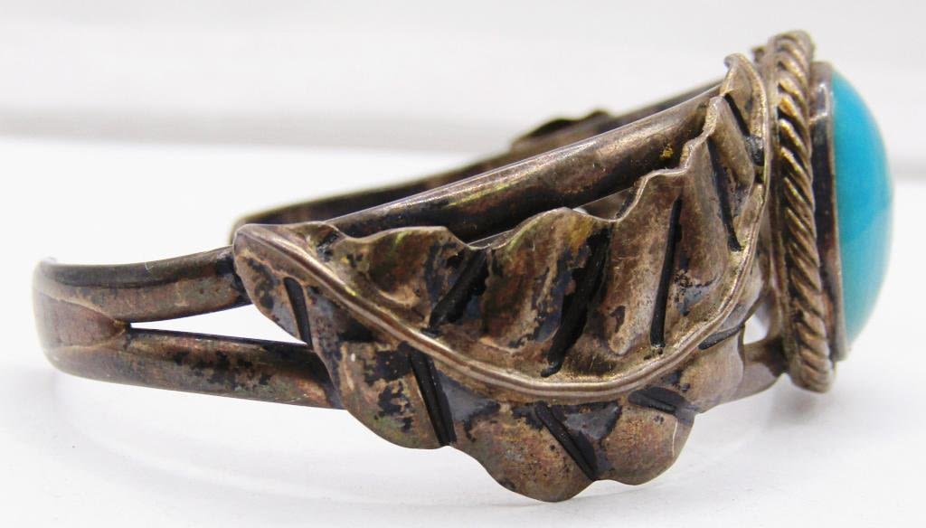 LEAF DESIGN ON BAND-TURQUOISE CENTER STONE-MEASURES 7.5 INCHES WITH GAP-TOTAL 16 DWT