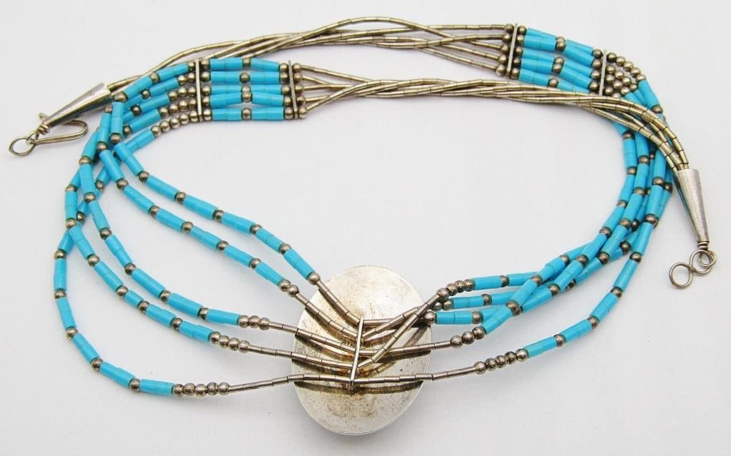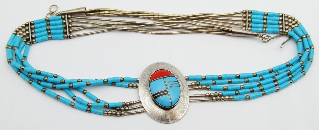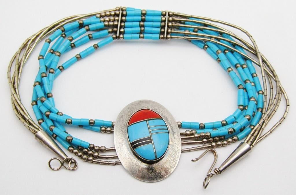 NECKLACE WITH TURQUOISE BEADS-ZUNI PENDANT WITH RED CORAL AND TURQUOISE INLAY DESIGN-MEASURES 16 INCHES-TOTAL 11 DWT