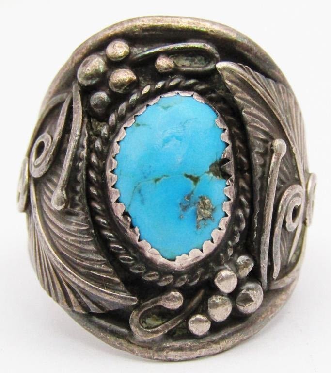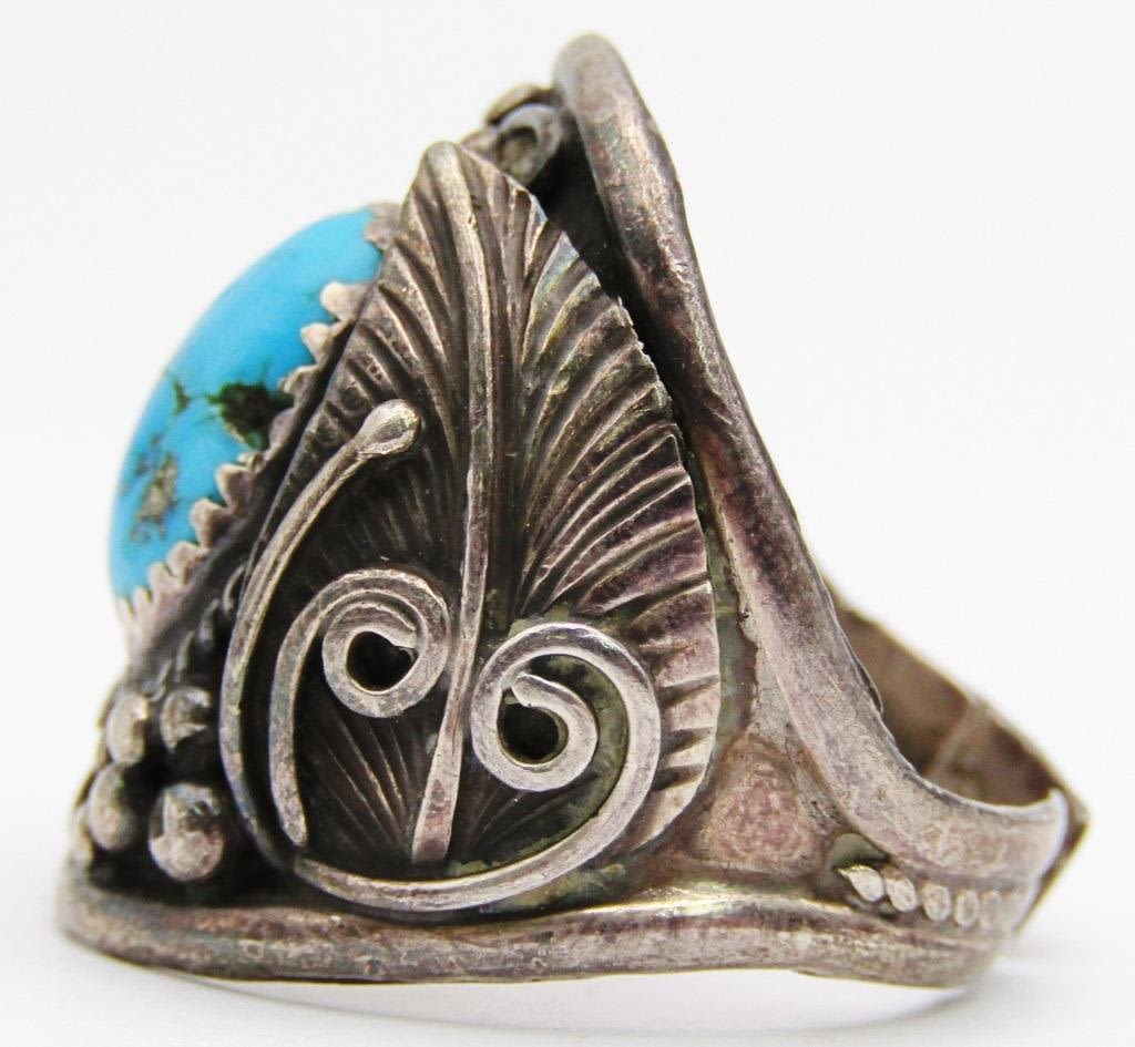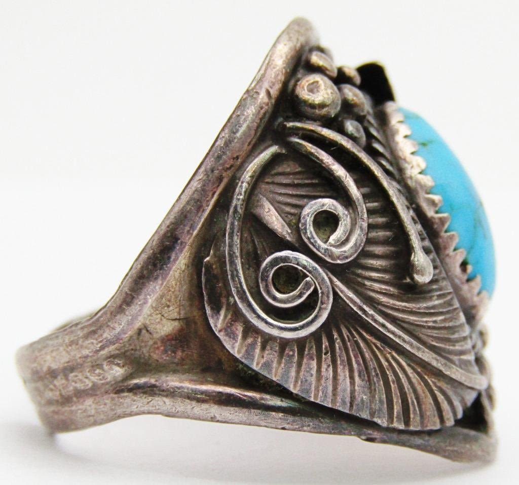 DESIGN ON BAND-TURQUOISE CENTER STONE-NEEDS REPAIR-RING SIZE 11-TOTAL 7 DWT