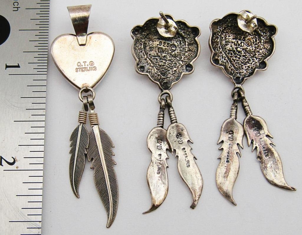 INLAY DESIGN & FEATHER CHARMS PLUS MATCHING PAIR OF PIERCED DANGLY EARRINGS-TOTAL 8 DWT