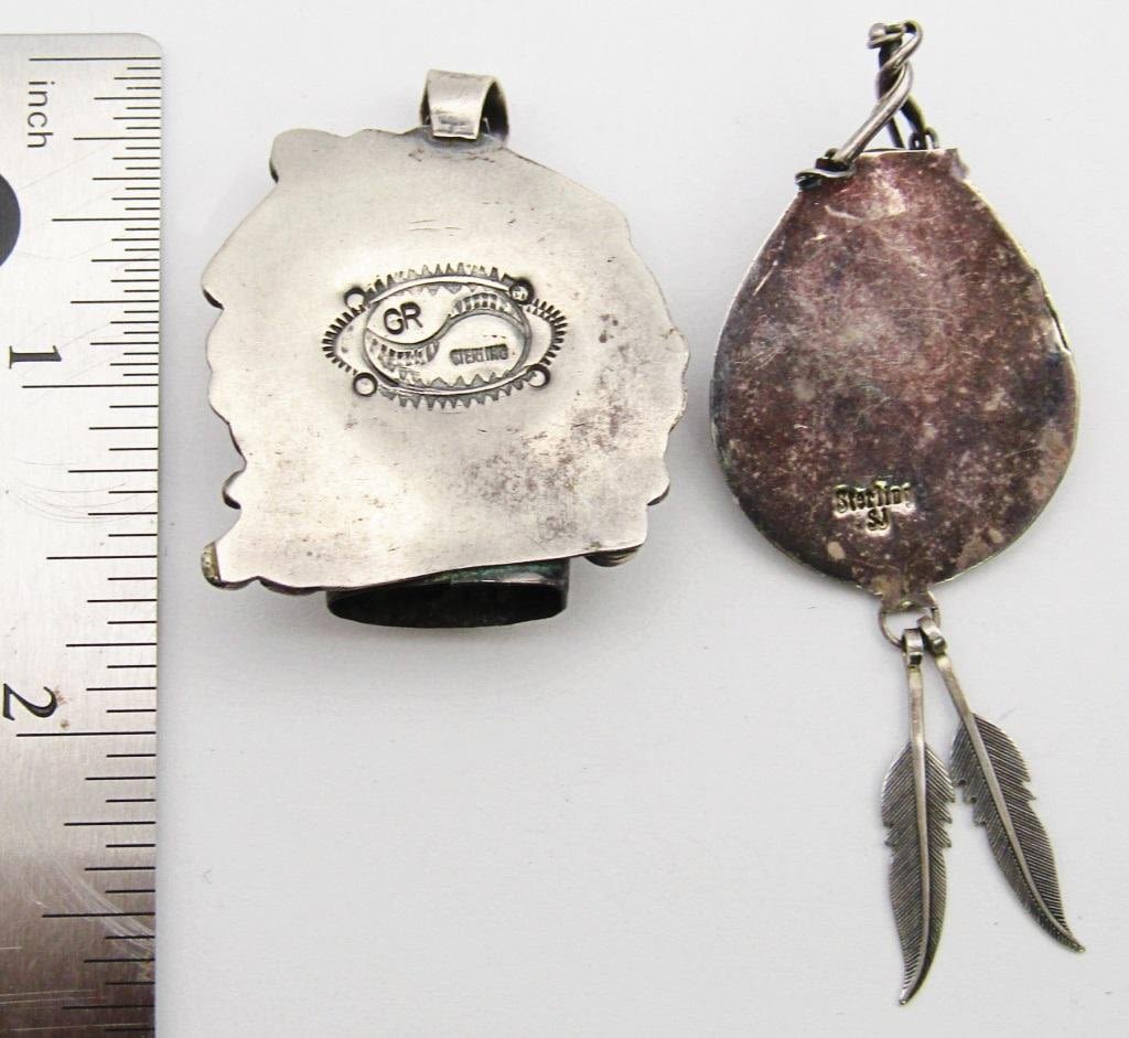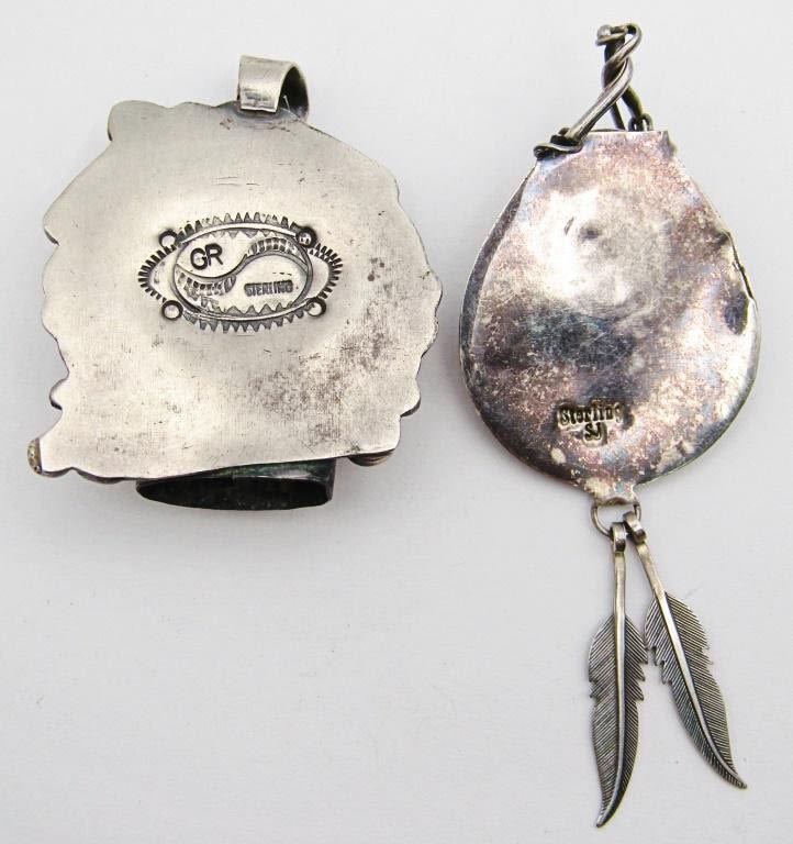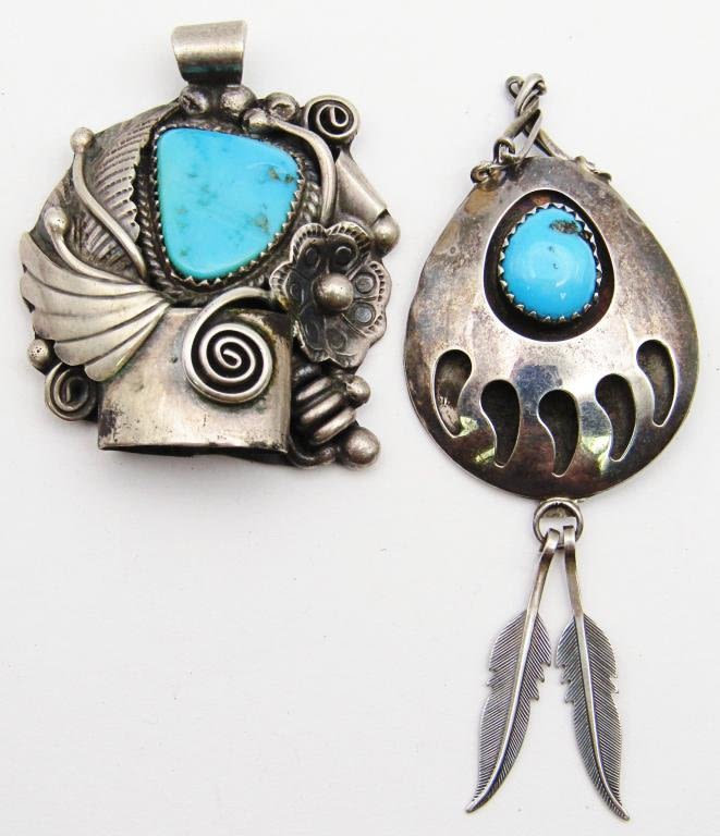 TURQUOISE STONES (1)MARKED "GR" & (1) "SJ" MARKED BEAR CLAW WITH FEATHER CHARMS-TOTAL 14 DWT