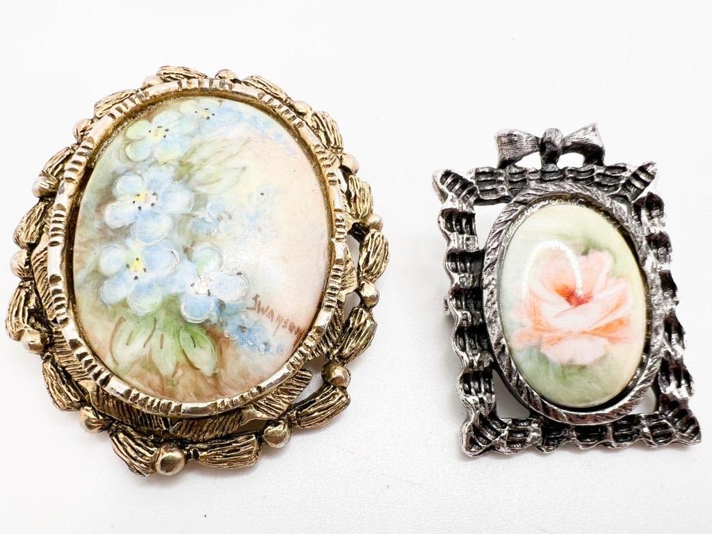 2 FLORAL CAMEO BROOCHES, LIGHT BLUES AND PINKS