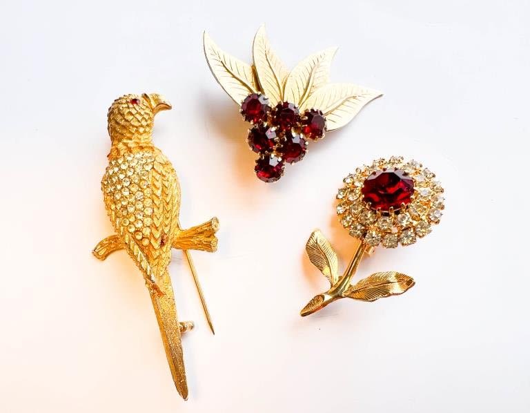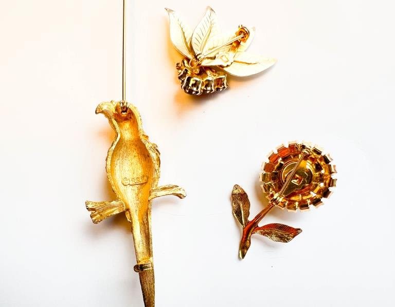 BSK SIGNED BIRD, FLORAL BROOCHES, BEAUTIFUL STONES