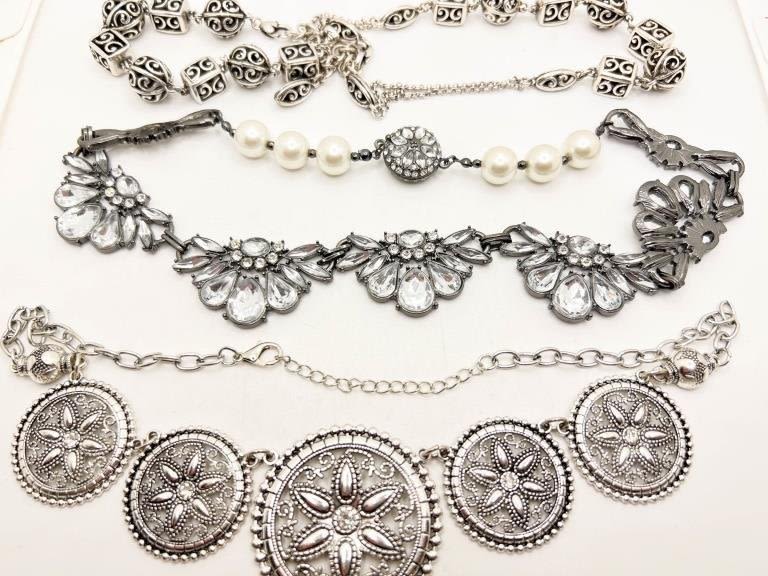 LARGE STYLISH NECKLACES TRIO , SILVER TONES, FLORALS